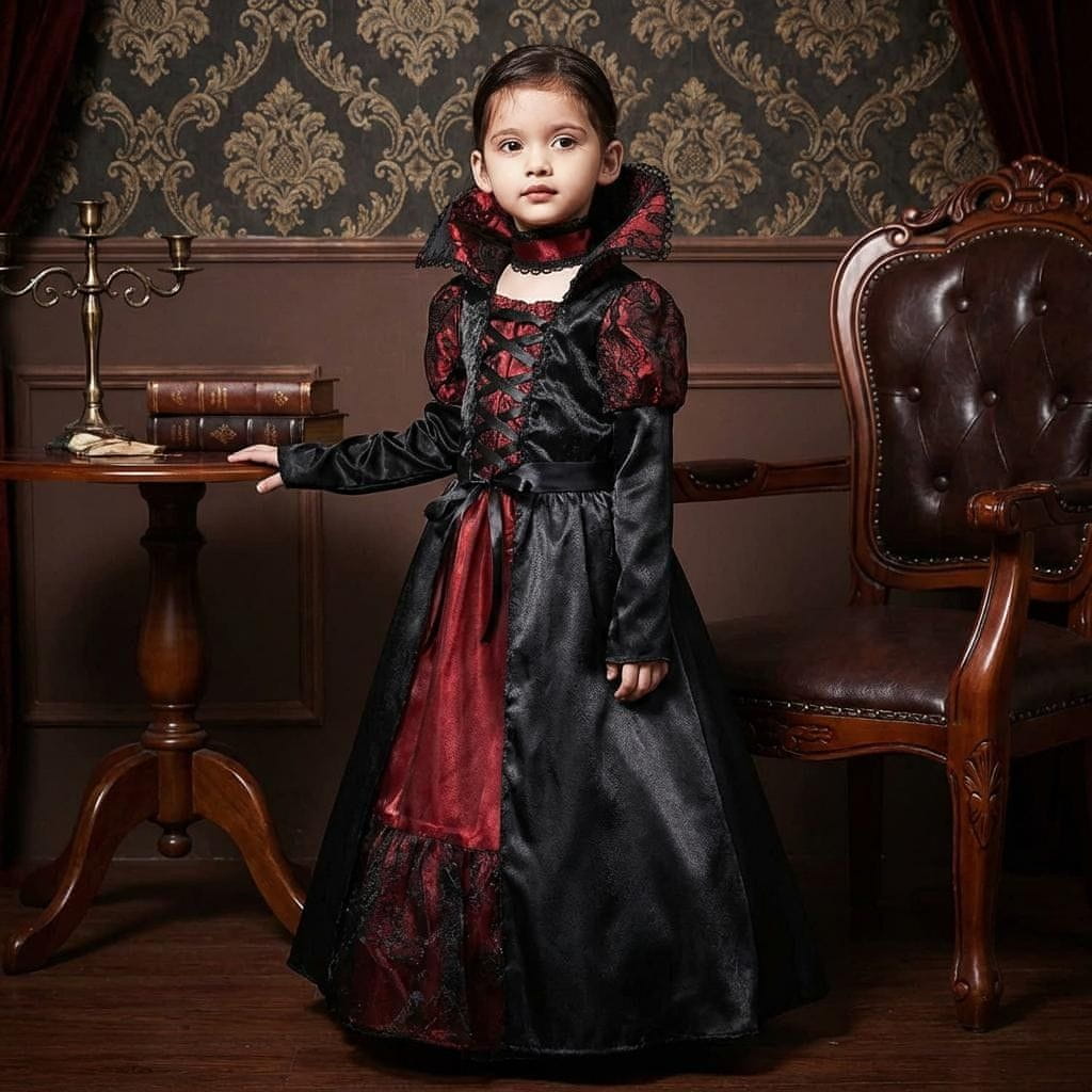 Spremenite svojega otroka v elegantno kraljico noči s tem edinstvenim kostumom vampirke, ki je zasnovan za nepozabna praznovanja. Ta elegantna oprava v klasični črno-bordov rdeči barvni kombinaciji predstavlja popolno mešanico mračnega vzdušja noči čarovnic in otroške elegance. Obleka je izdelana iz visokokakovostnega poliestra, ki je mehak, zračen in prijazen do občutljive otroške kože, kar zagotavlja visoko raven udobja tudi med večurnim pustnim rajanjem. Z uporabo značilnega visokega ovratnika in zapletenih vstavkov iz vezene čipke z motivom pajčevine kostum doseže pristno gotsko podobo, ki bo navdušila na vsakem dogodku.
