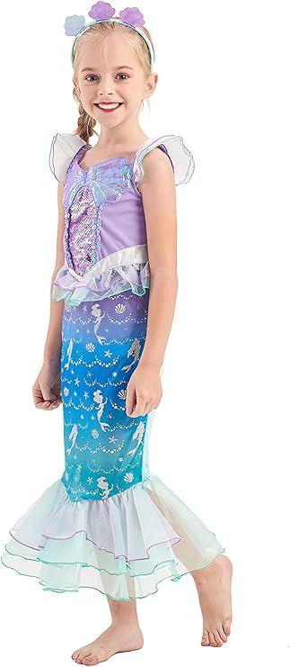 Nikcorp Pustni kostum morska deklica za deklice, bleščeča obleka z naglavnim obročem in luskami, 140 cm (8-10 let)
