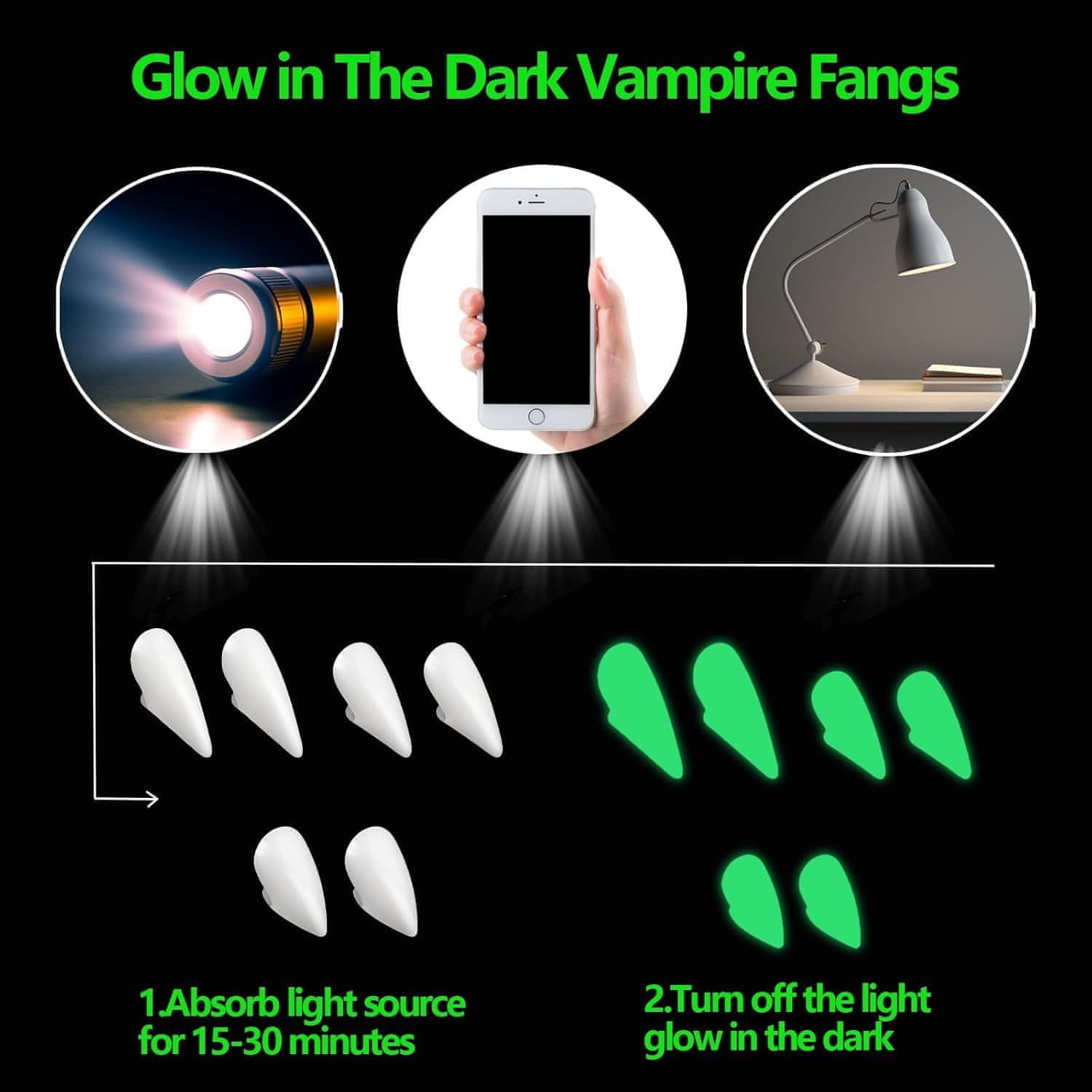 Nikcorp Vampirski zobje umetni podočniki svetleči v temi, 13-17 mm, set 3 parov z lepilom, za noč čarovnic in cosplay