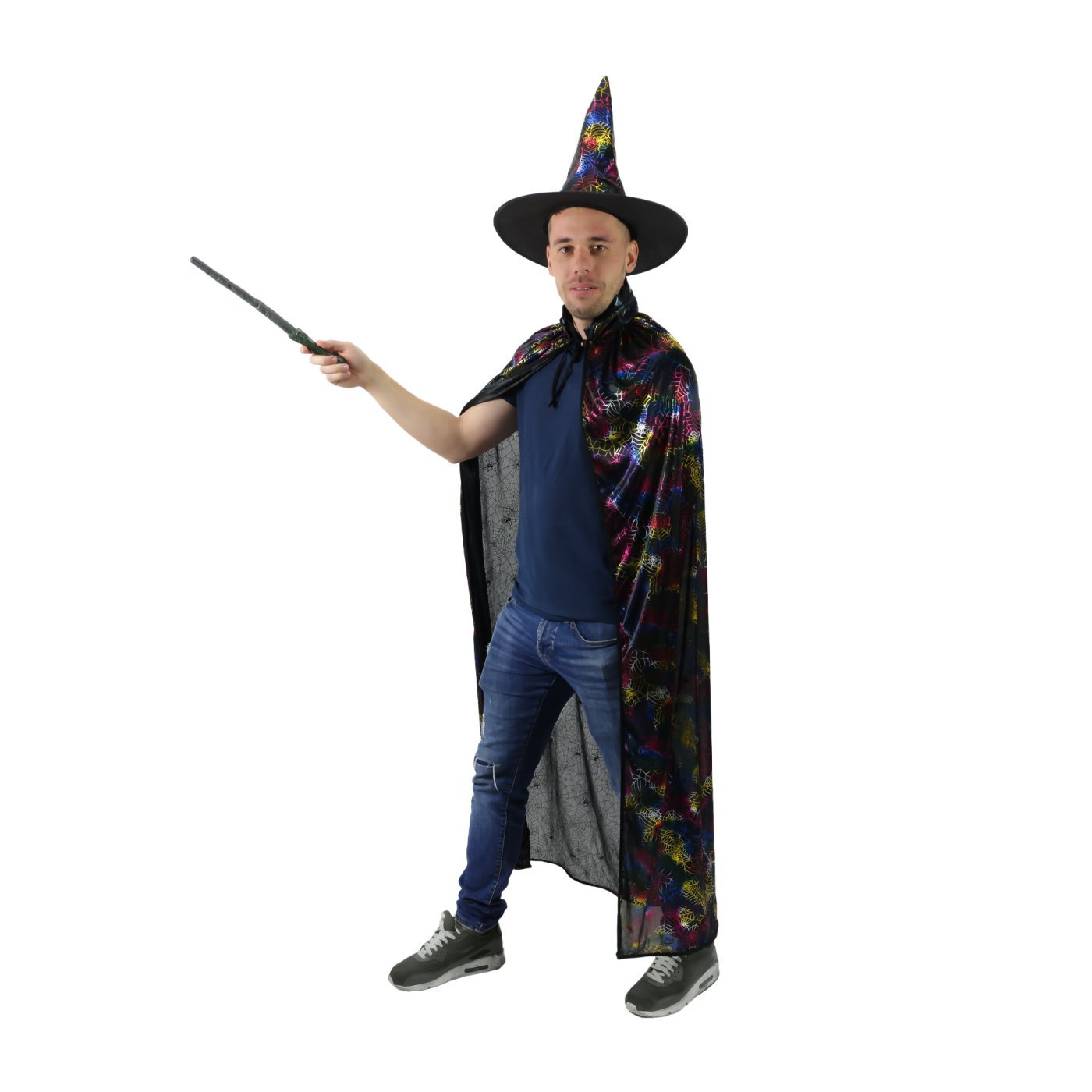 Udaren črn plašč za vse čarovnike in čarovnice! Plašč je namenjen odraslim in je okrašen s potiskom pisanih pajkovih mrež. Kostumu je priložen popolnoma usklajen klobuk. Plašč je dolg približno 140 cm. Idealen za karneval ali zabavo za noč čarovnic. Palica ni vključena.