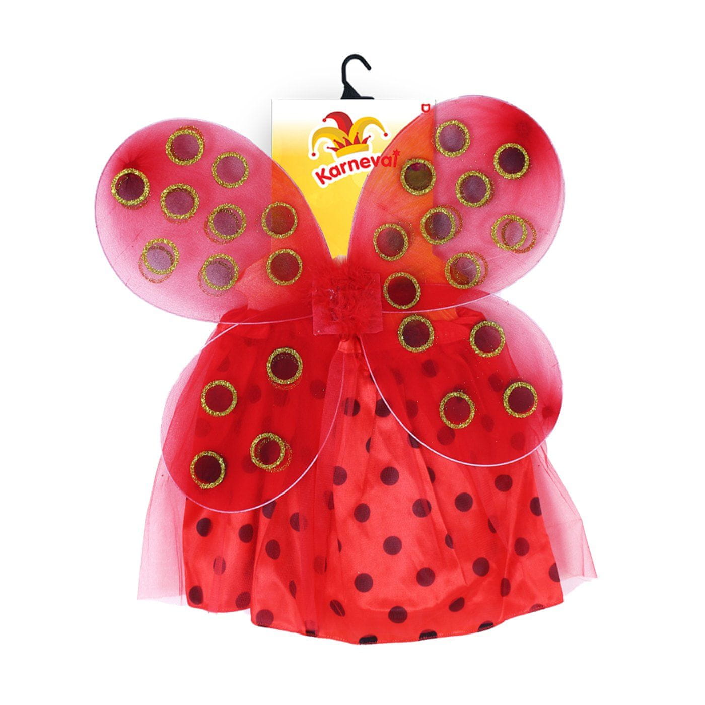 Premenjajte se v dateljno s tem prikupnim kostumom! Rdeči kostum je namenjen deklicam, starim od 3 do 7 let. Paket vključuje krilo s pikami in popolnoma ujemajoča se krila. Krilo, ki je v pasu elastično, je dolgo približno 30 cm.