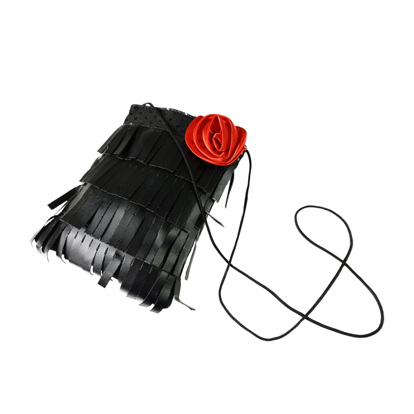 Elegantna črna torba, okrašena z rdečo satenasto vrtnico. Vrečka meri 15 × 21 cm, dolžina ročaja je približno 55 cm. Popoln dodatek za zabavo!