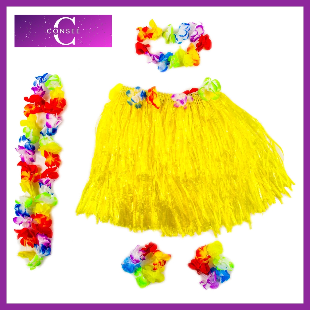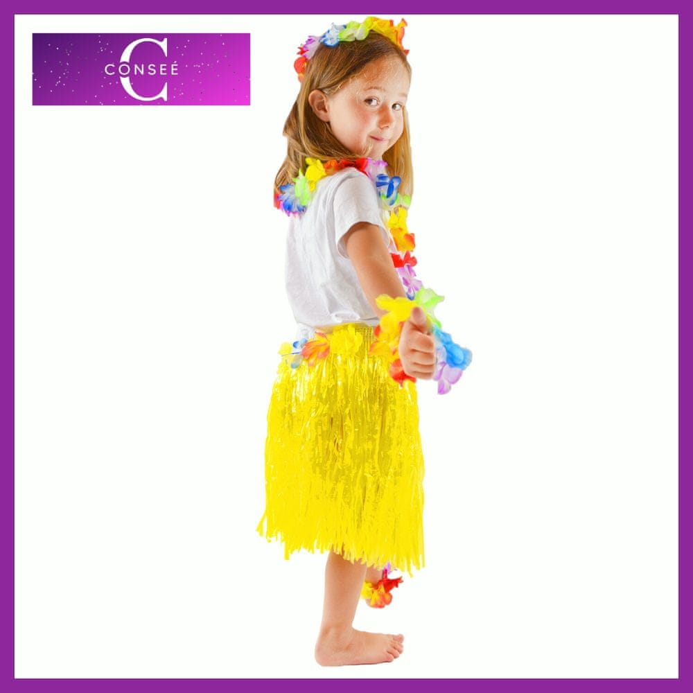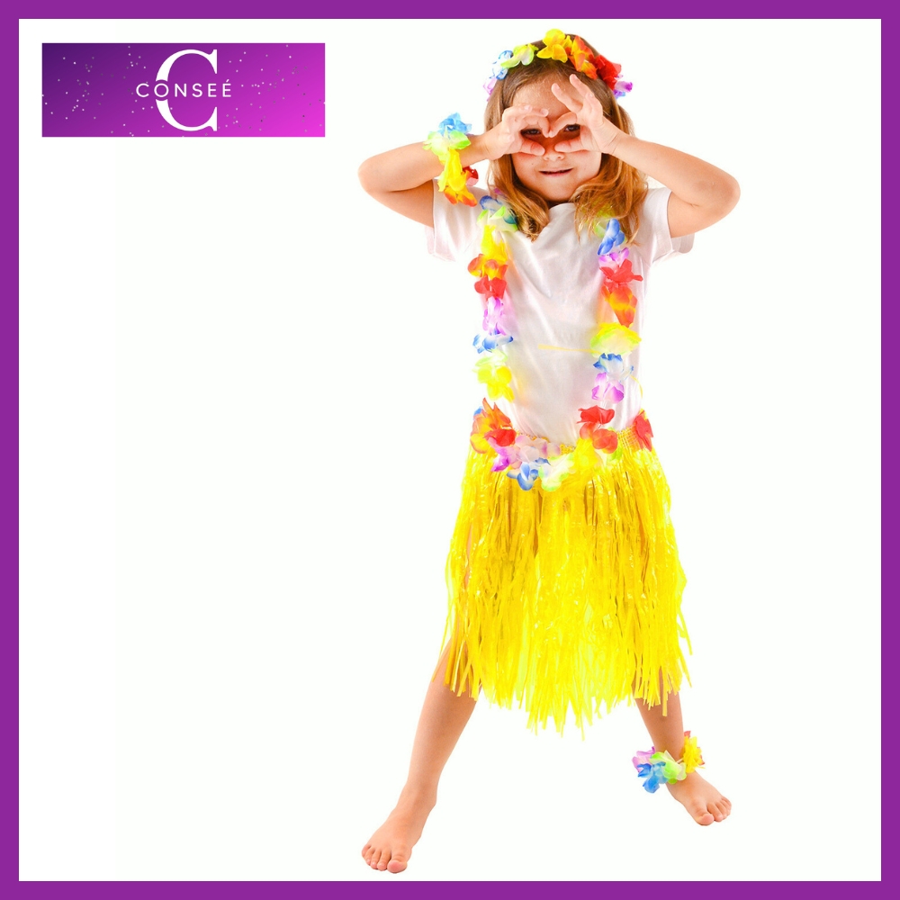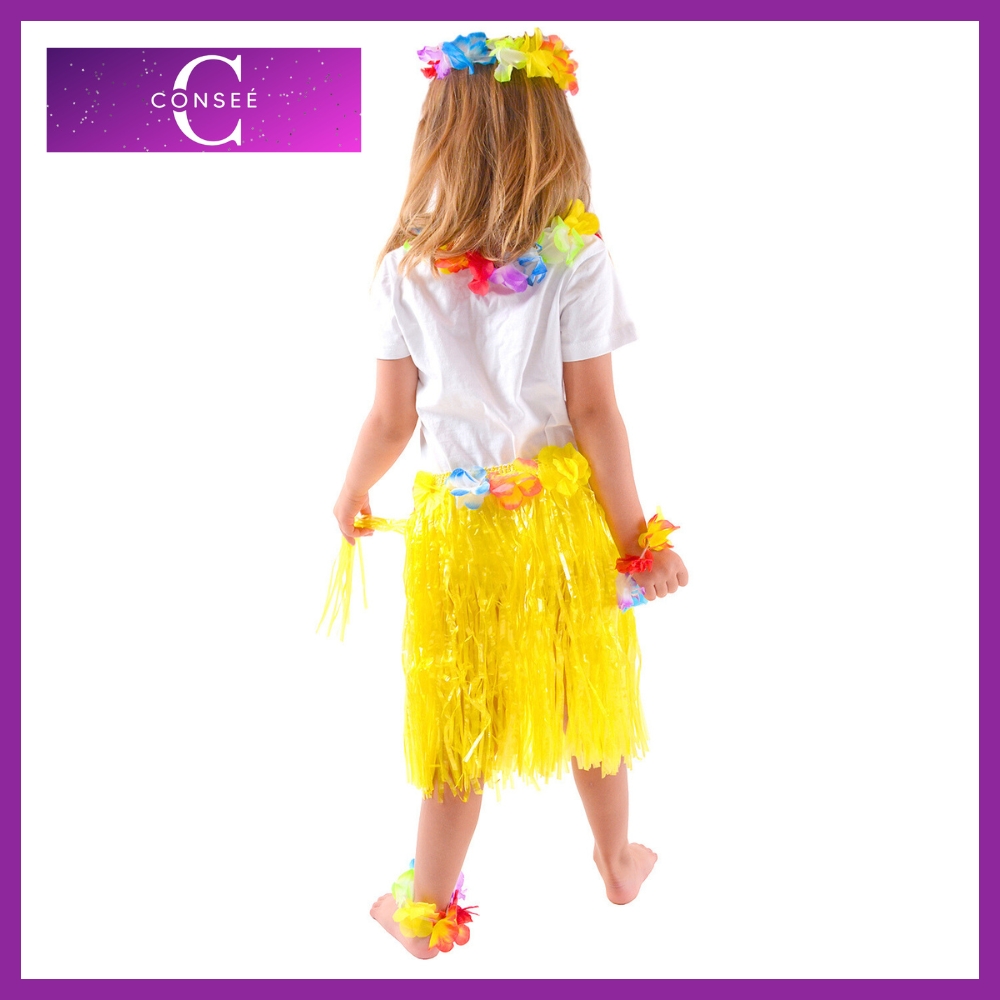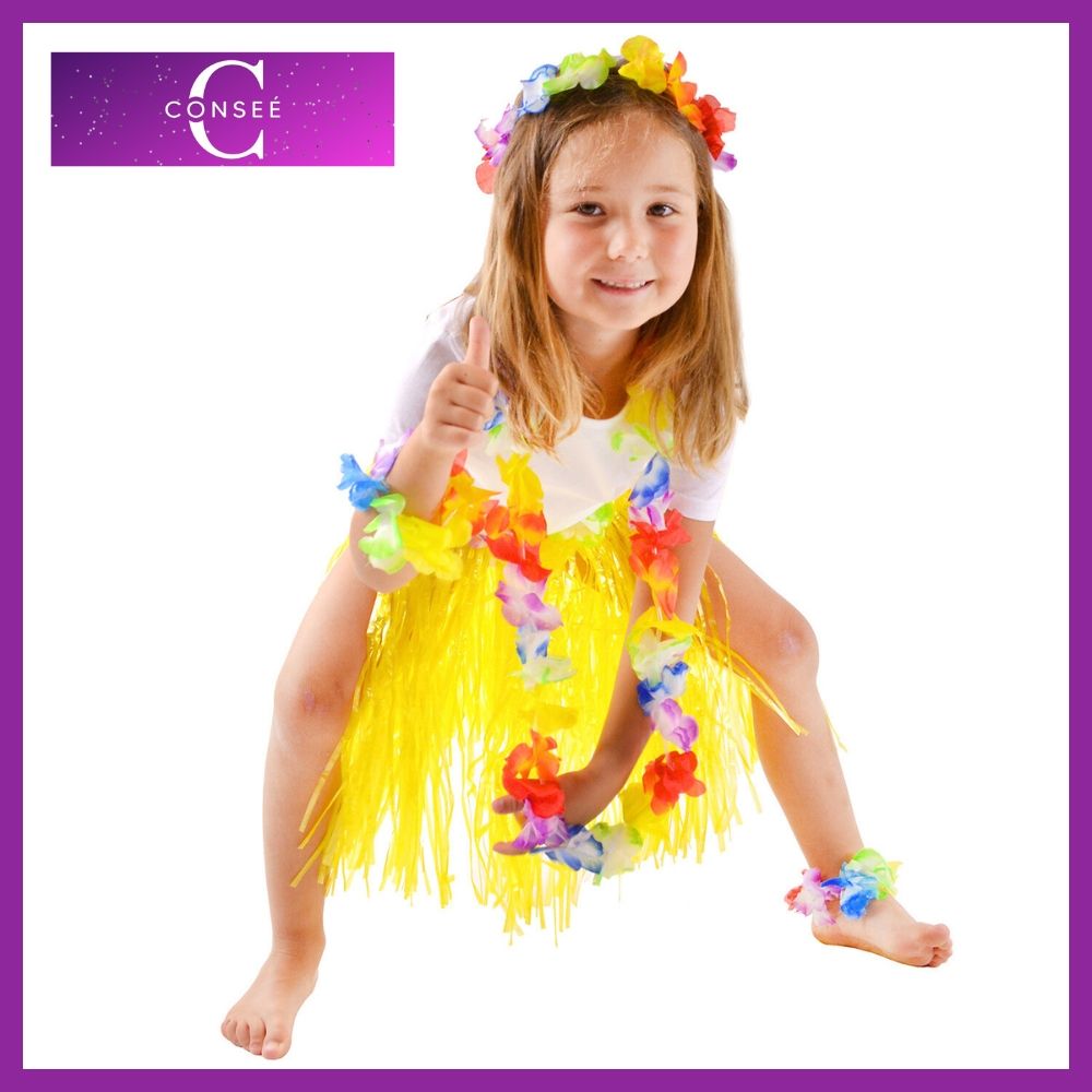 Z našim kompletom se lahko vsaka deklica počuti kot prava plesalka hula! Padajoče, pisano krilo in cvetlični dodatki vas bodo popeljali v vzdušje eksotičnega otoka, tudi v lastnem domu.