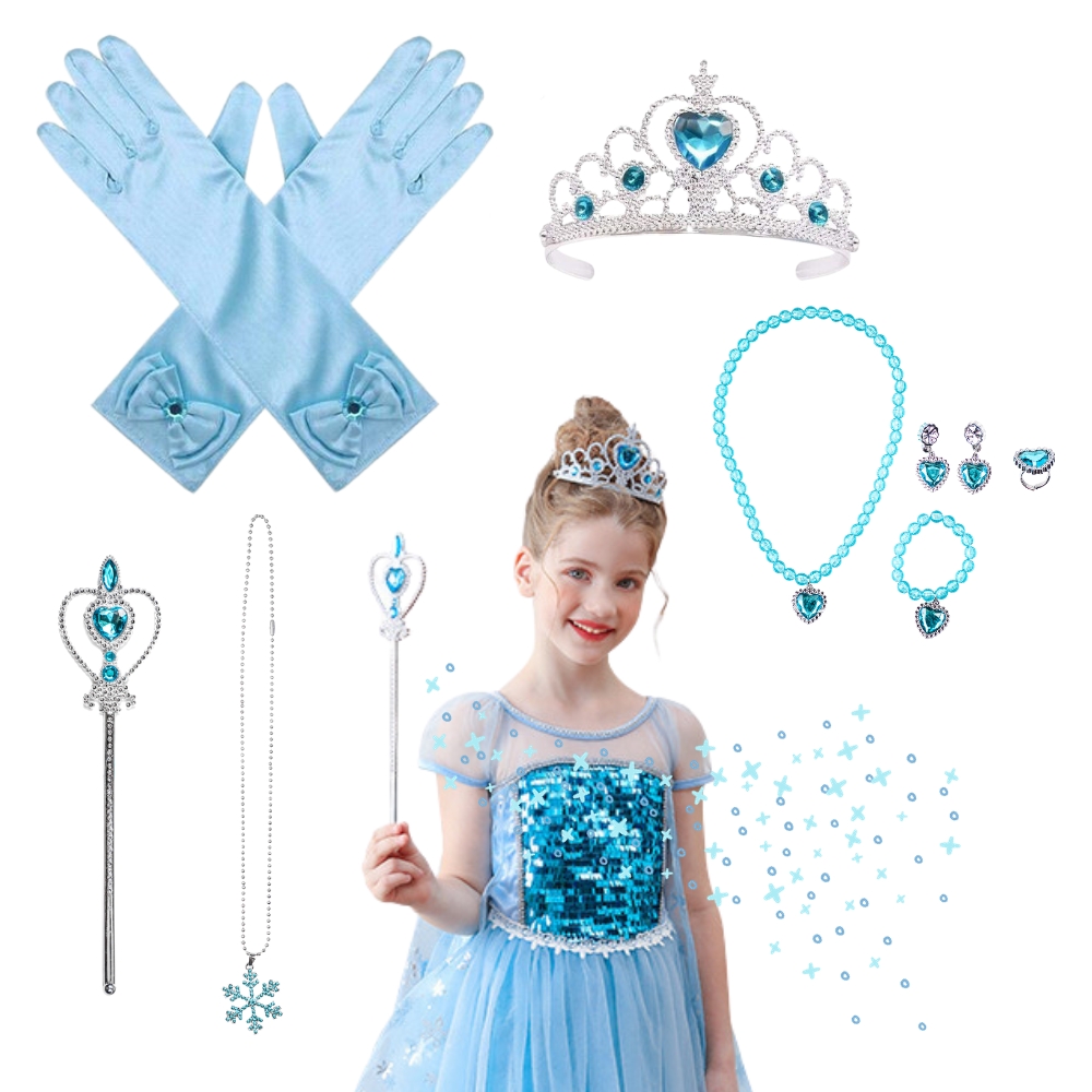 Naš komplet princese je svetlo modre barve, ki je najbolj modna in brezčasna barva. Vaša hči bo imela ogromno izbiro, kateri pravljični lik želi biti. Dodatki bodo spodbudili bogato domišljijo vašega otroka in zagotovo pričarali čudovit svet igre.
