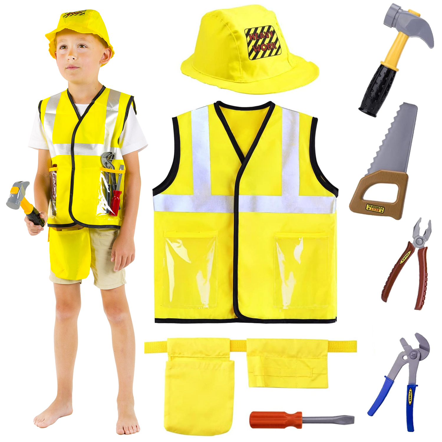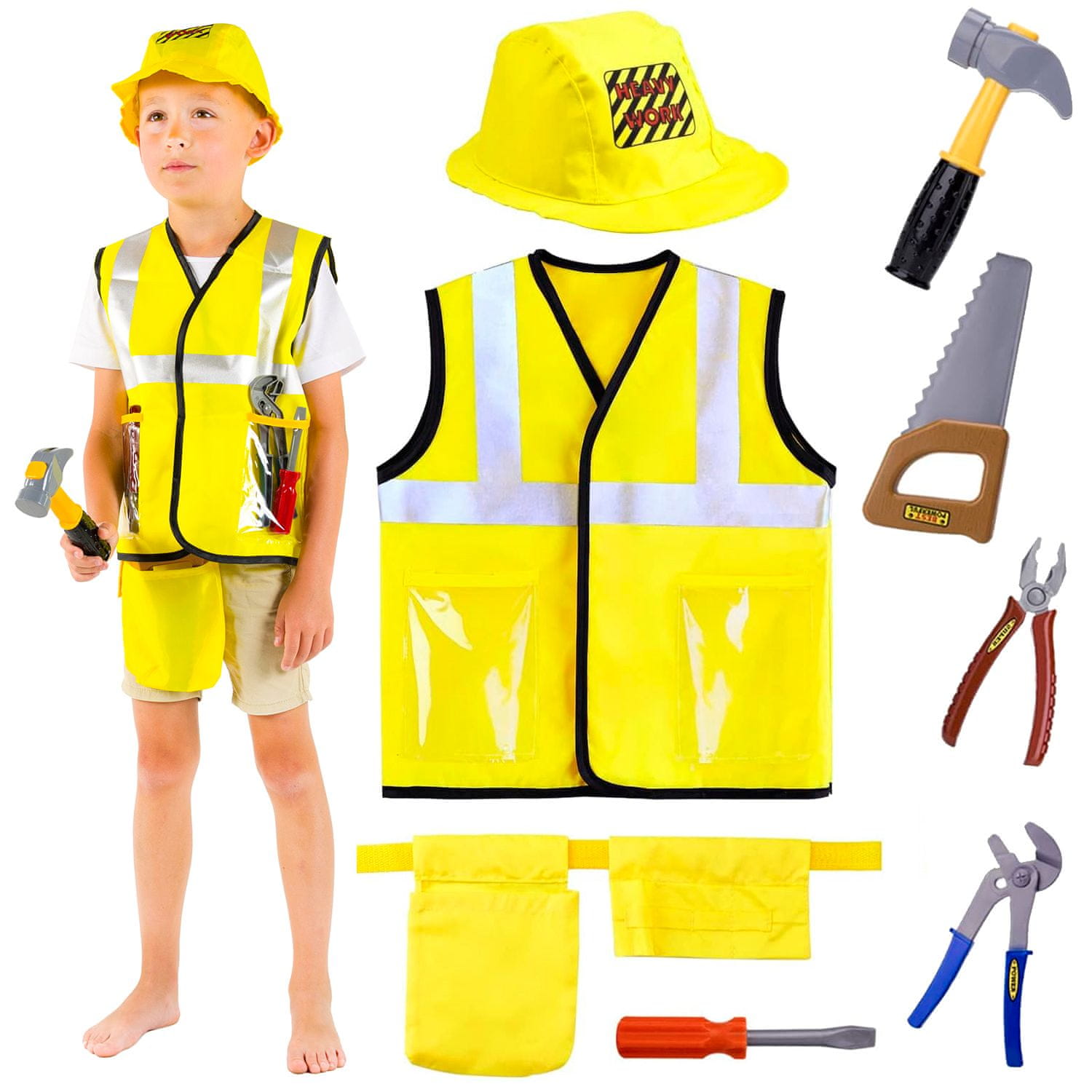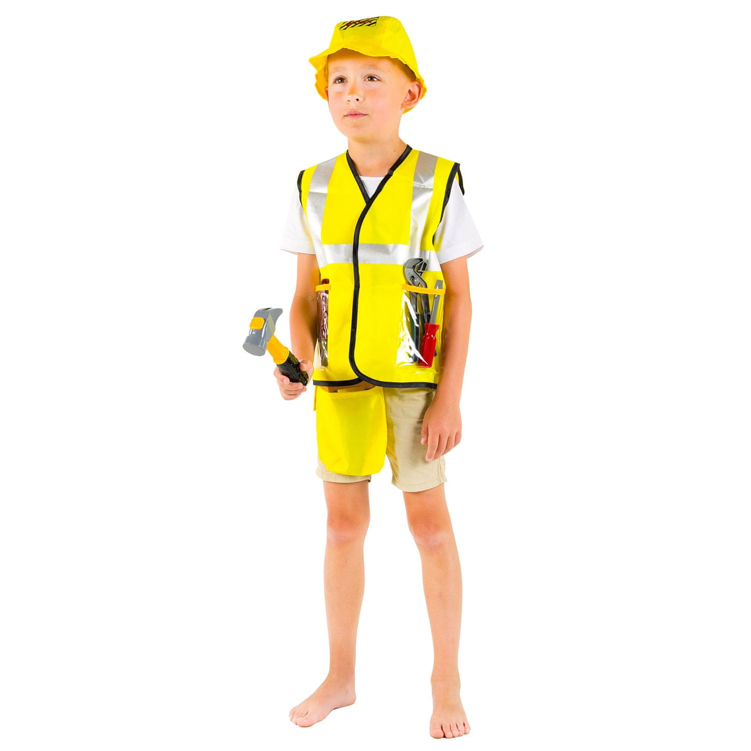 V našem kompletu kostuma graditelja Boba ne boste prejeli le edinstvene obleke, temveč tudi vsa potrebna orodja, s katerimi bo otrokova igra še bolj realistična in razburljiva. Komplet je sestavljen iz: