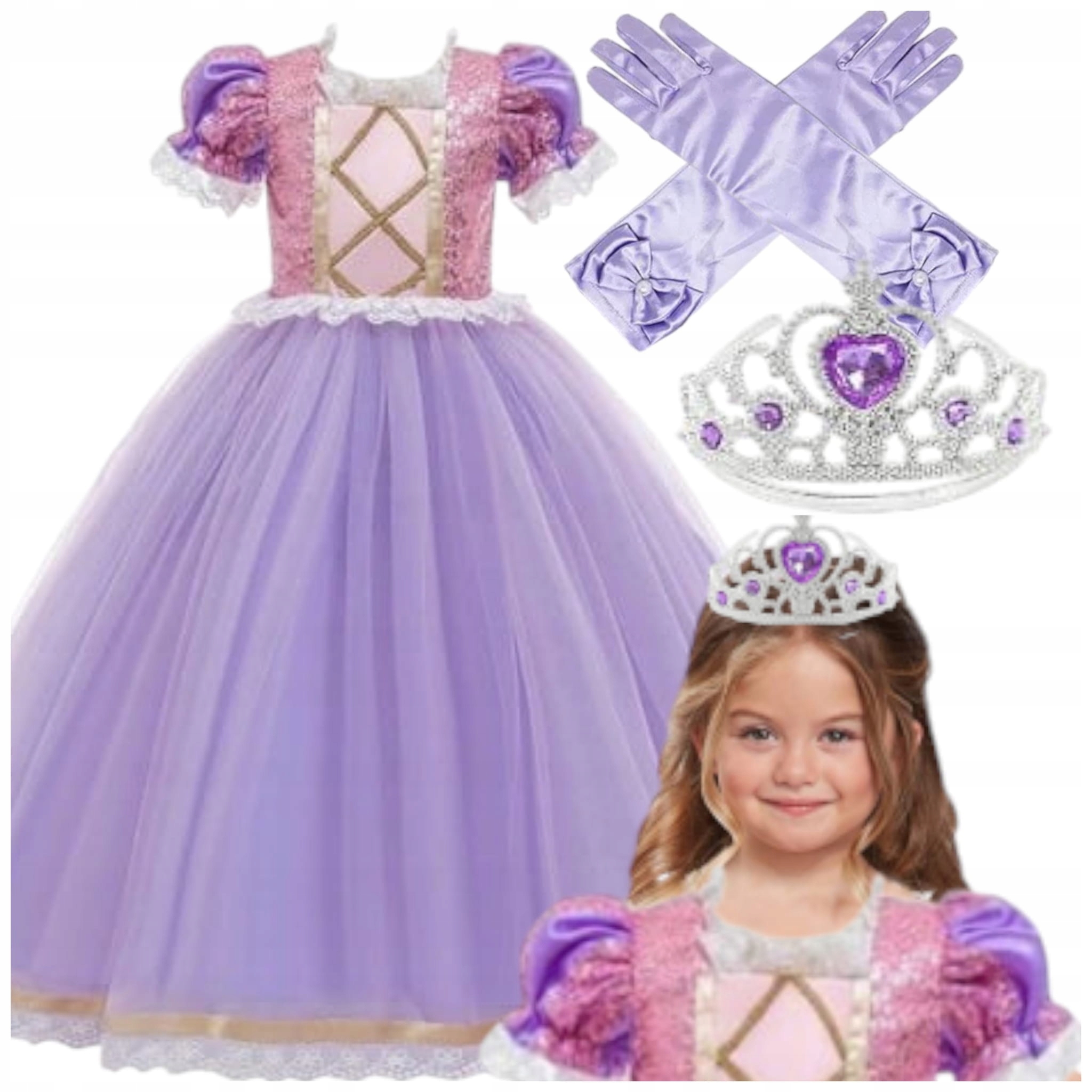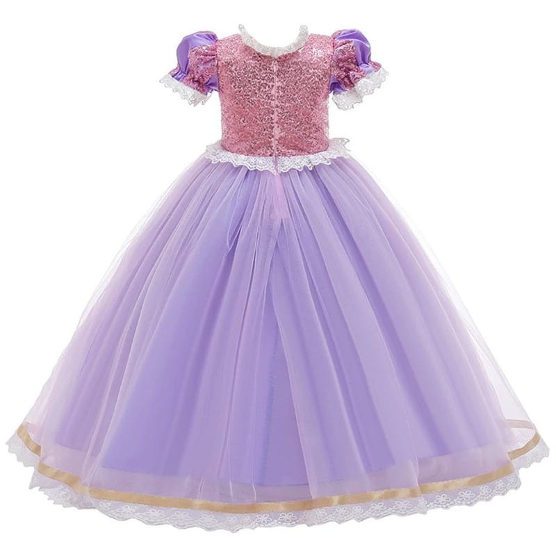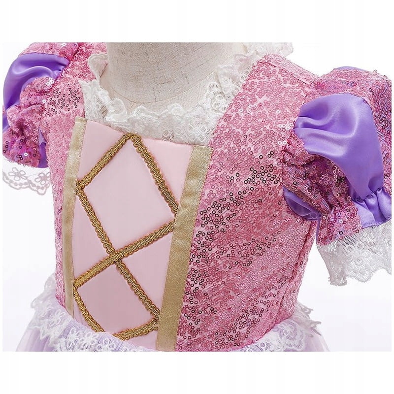 Obleka je bila skrbno zasnovana tako, da odraža slog in edinstvenost Rapunzelinega lika. Izdelana iz mehkih in prijetnih materialov na dotik, obleka zagotavlja udobje in svobodo gibanja med igro in zabavami z preoblačenjem. Čudoviti detajli, kot so okrašena čipka in bleščeči poudarki, dajejo tej obleki edinstven značaj. Njegova elegantna oblika črpa navdih iz čarobnega sveta, ki očara tako mlade kot stare.