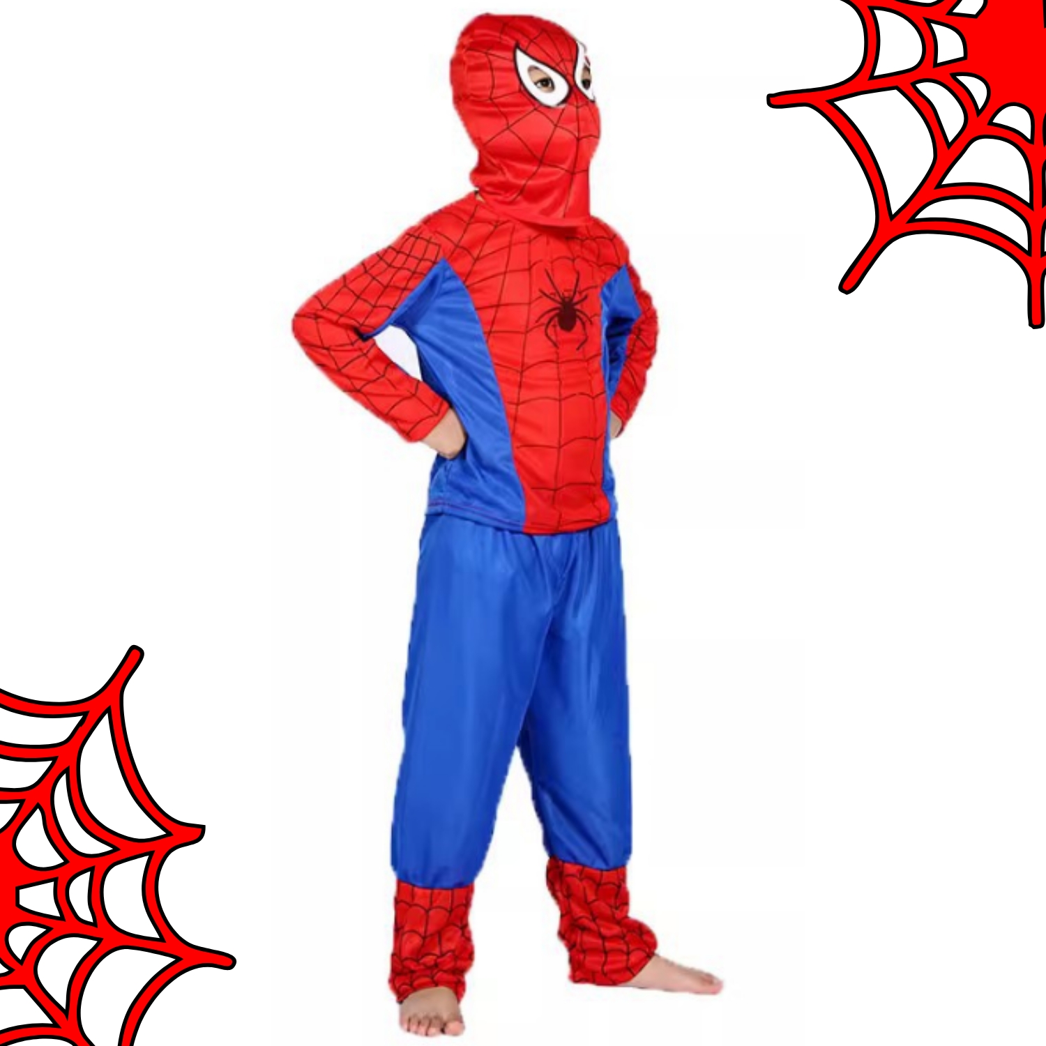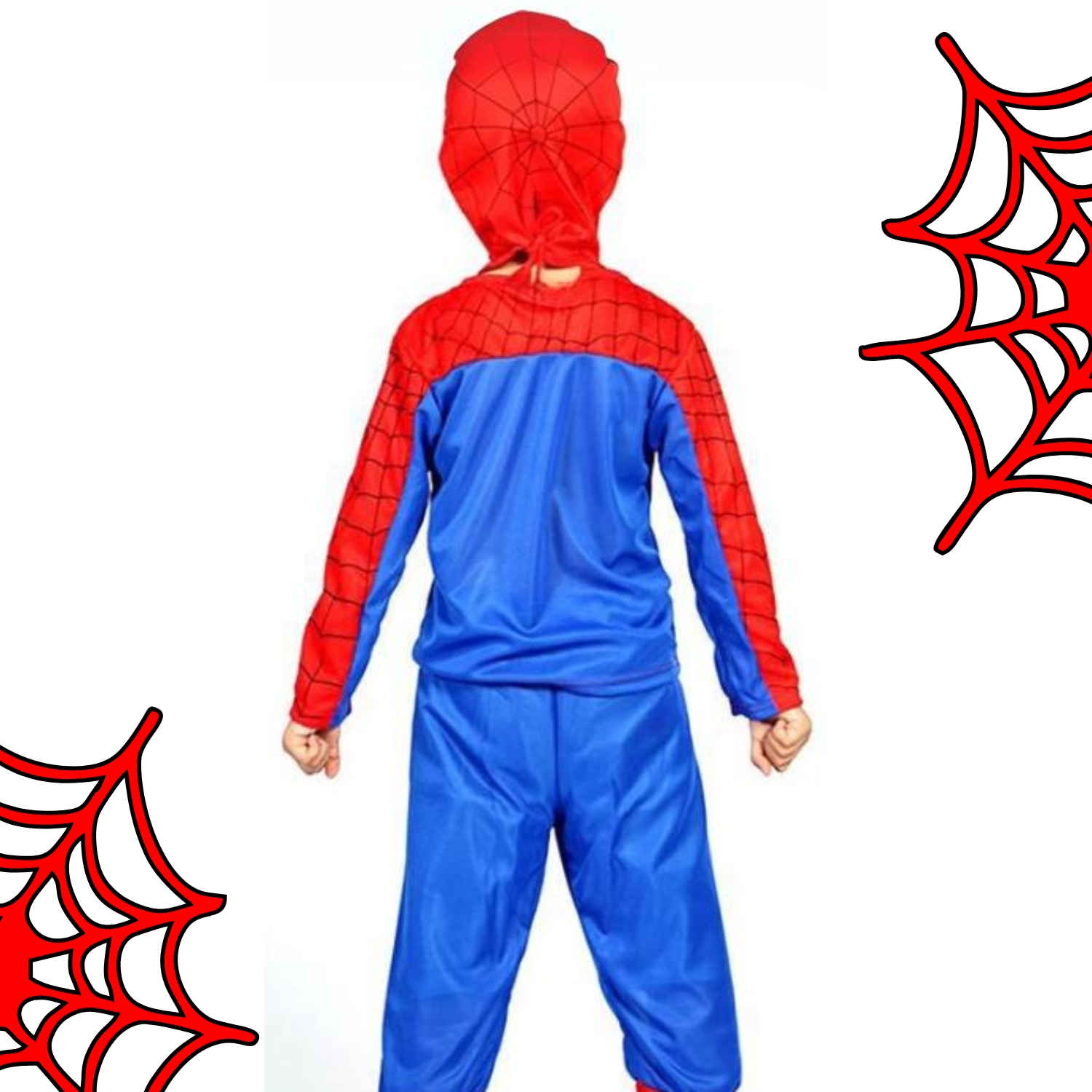 ✴️ HLAČE – Hlače se popolnoma ujemajo s preostalim delom oblačila, v rdeče-modri barvni shemi. Zgornji del hlač je moder, od kolen navzdol pa se preliva v rdečo, okrašen s pajkovo mrežo, kar ustvarja celovit videz superjunaka. Elastičen pas zagotavlja udobno prileganje in zagotavlja, da hlače ostanejo na mestu med vso akcijo.