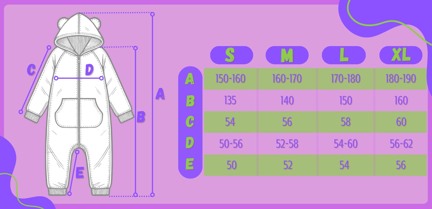 zabavo ali vsakodnevno nošenje! ❕ Kostume merimo ravno, brez raztegovanja materiala. Ker to počnemo ročno, je dovoljena napaka pri merjenju +/- 5 cm. ❕ Za pravilno izbiro dolžine kigurumija glede na vašo višino vzemite merilni trak in izmerite dimenzije v skladu z grafiko. Meritev izvedite v stoječem položaju in pri tem prosto dihajte. Nato rezultat primerjajte s tabelo velikosti.