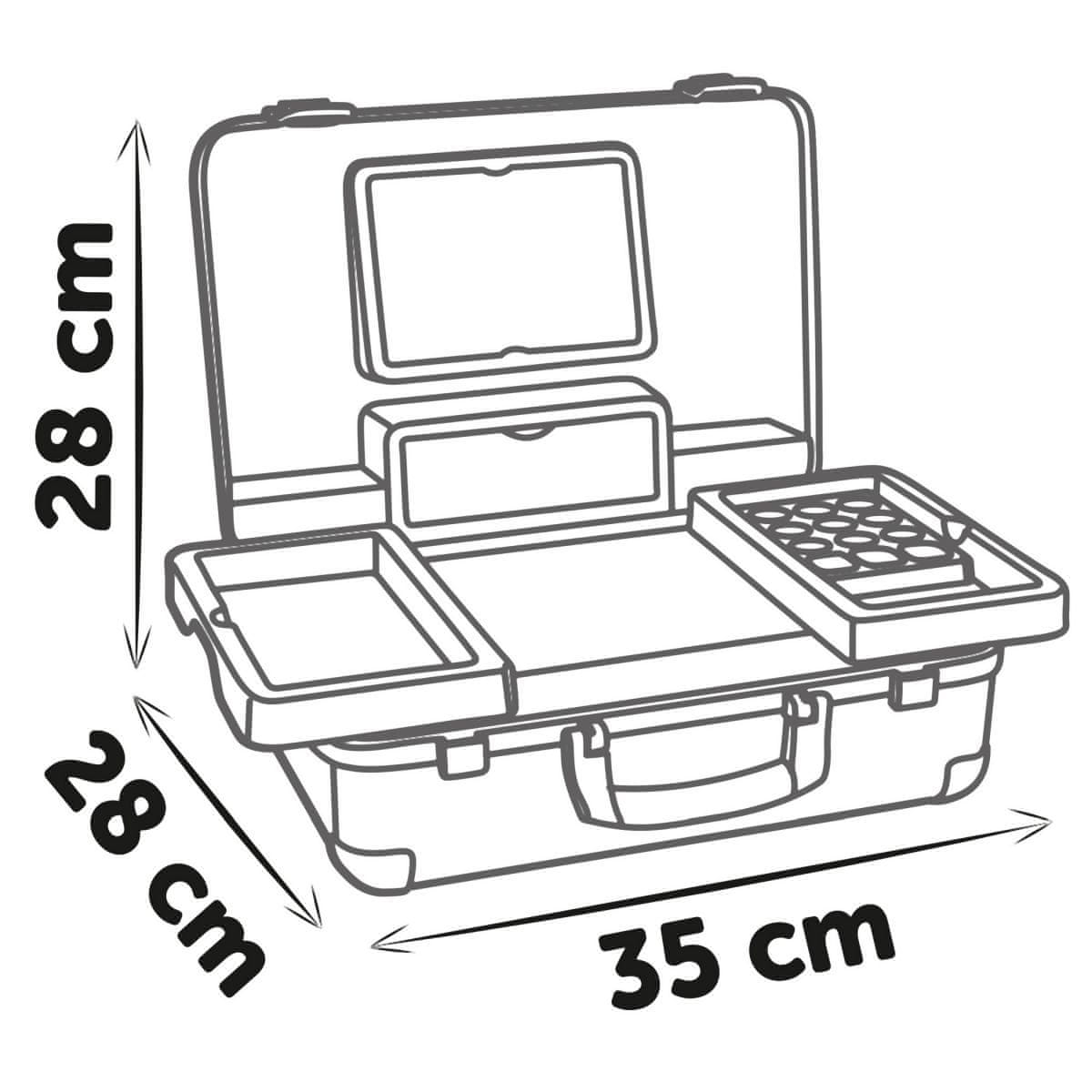V kovčku My Beauty Case je vse, kar potrebujete za odlično mobilno wellness izkušnjo, ne glede na to, ali gre za striženje, nego nohtov ali ličenje. Vseh 13 dodatkov (lutke kozmetike za igro) najdete v kovčku z ročajem, ki ga lahko vzamete kamor koli: 2 laka za nohte, 2 šminki, paleto senčil, maskaro, glavnik, naglavni trak, prstan in različne stekleničke. Zahvaljujoč možnosti zaklepanja se iz kovčka na poti ne bo nič izgubilo. Poleg tega ima ogledalo in skrivni predal. Police v notranjosti lahko zložite in tako ustvarite prostor za dodatno kozmetiko. Dimenzije izdelka (DxŠxV): 28 × 35 × 28 cm.
