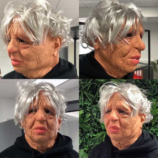 Na masko je pritrjena pepelnato siva lasulja, ki poglobi iluzijo.