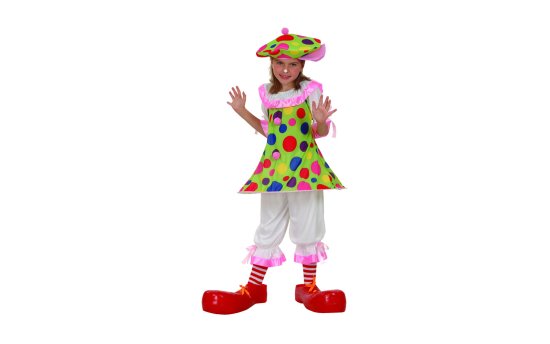 Otroški pustni kostum klovnesa vsebuje srajco, hlače in klobuk (čevlji in nogavice niso priloženi).Velikost S (110–120 cm), M (120–130 cm) in L (130–140 cm). Celoten opis