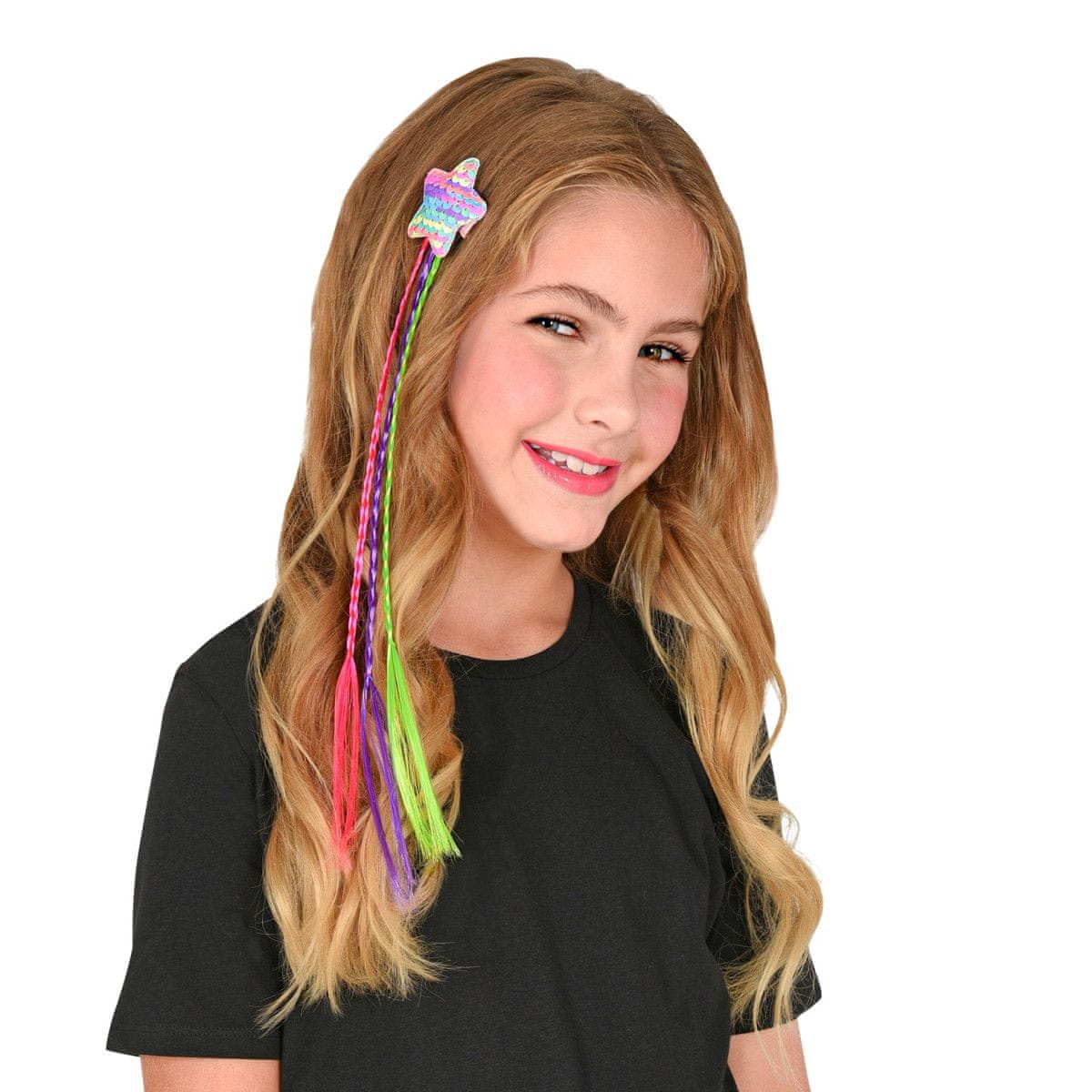 Lasni podaljšek za deklice s tremi kitkami, ki so v roza, zeleni in vijolični barvi. Pod zvezdo z bleščicami je pritrjena sponka, s katero se lasni podaljšek enostavno pritrdi na obstoječe lasišče. Celoten opis