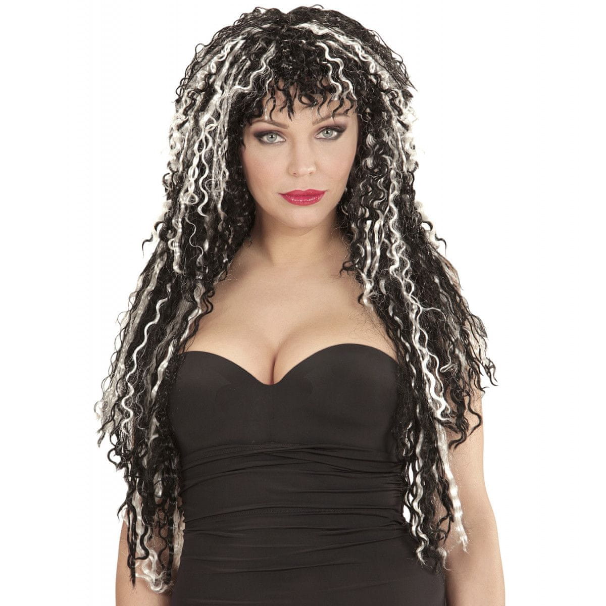 Ženska bela skodrana lasulja za vampirko. Lasulja z različnimi barvami pramenov sega vse do komolcev. Velikost je univerzalna. Celoten opis