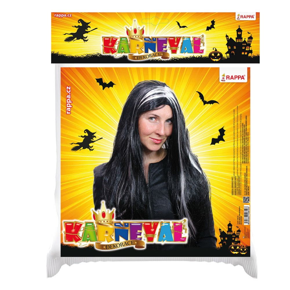 Karnevalska lasulja z motivom čarovnice. Lasulja ima dolge črne lase in je okrašena s srebrnimi poudarki. Odličen dodatek k vašemu kostumu!