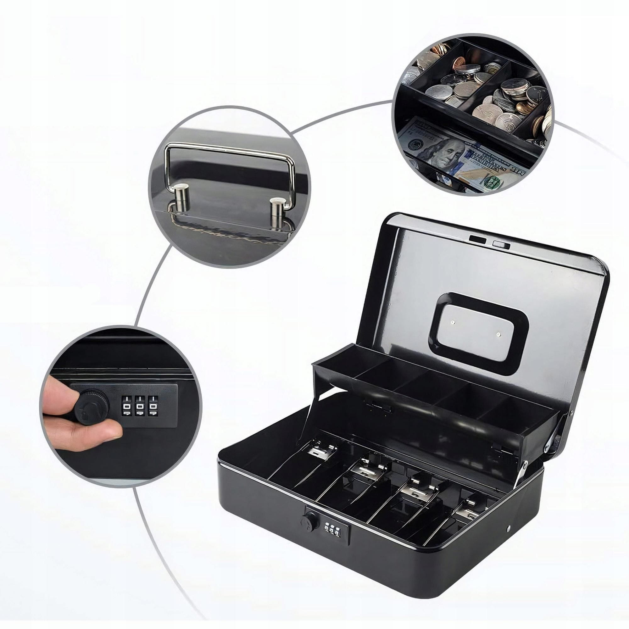 Blagajna ima zanesljivo kombinacijsko ključavnico, ki omogoča varno zaklepanje brez potrebe po skrbnem shranjevanju ključev. Praktične dimenzije omogočajo enostavno prenašanje in diskretno shranjevanje. Notranjost je opremljena z odstranljivim pladnjem za kovance in dodatnim prostorom za bankovce ali druge vredne predmete. Gumijaste podloge na dnu preprečujejo zdrs in ščitijo površino, na katero je postavljena.