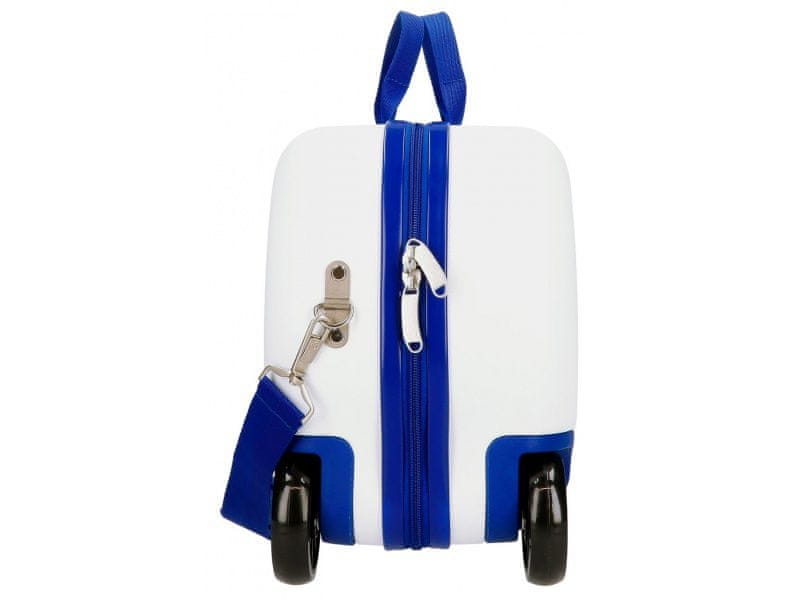 Sprednja dvojna vrtljiva kolesca omogočajo nemoteno premikanje in enostavno rokovanje. Kovček lahko vlečete kot voziček, ga s pasom nosite čez ramo ali pa na njem otrok udobno sedi.