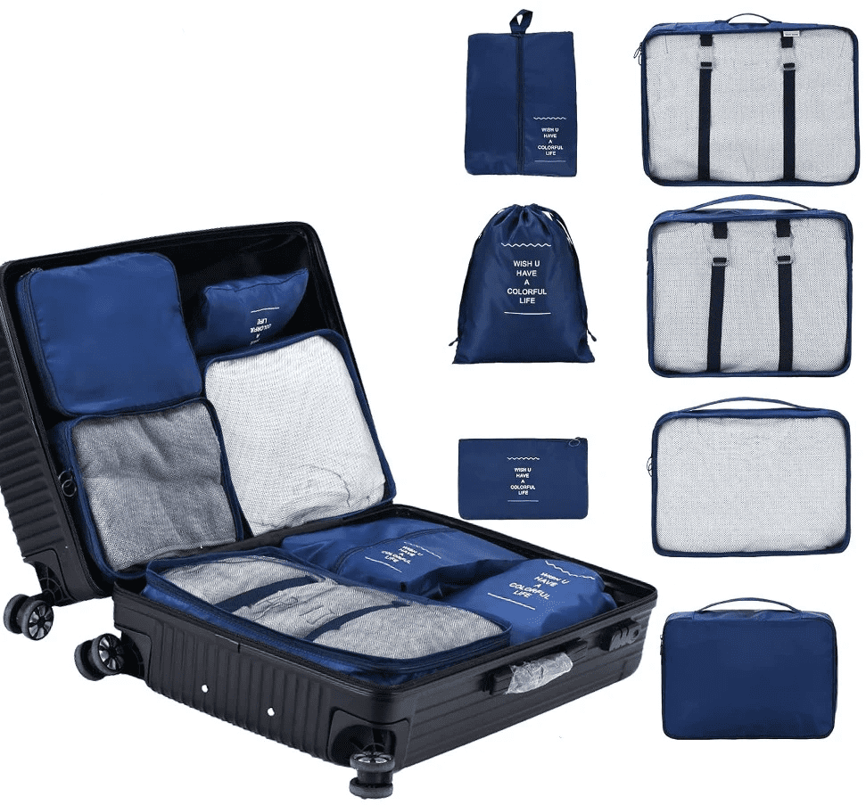 Potovalna garnitura 7 vodoodpornih organizatorjev je popolna rešitev za vsakogar, ki si želi ohraniti red med potovanjem. Ta garnitura, izdelana iz trpežnega in vodoodpornega materiala v privlačni modri barvi, se enostavno prilega večini kovčkov in nudi dovolj prostora za vse vaše stvari.