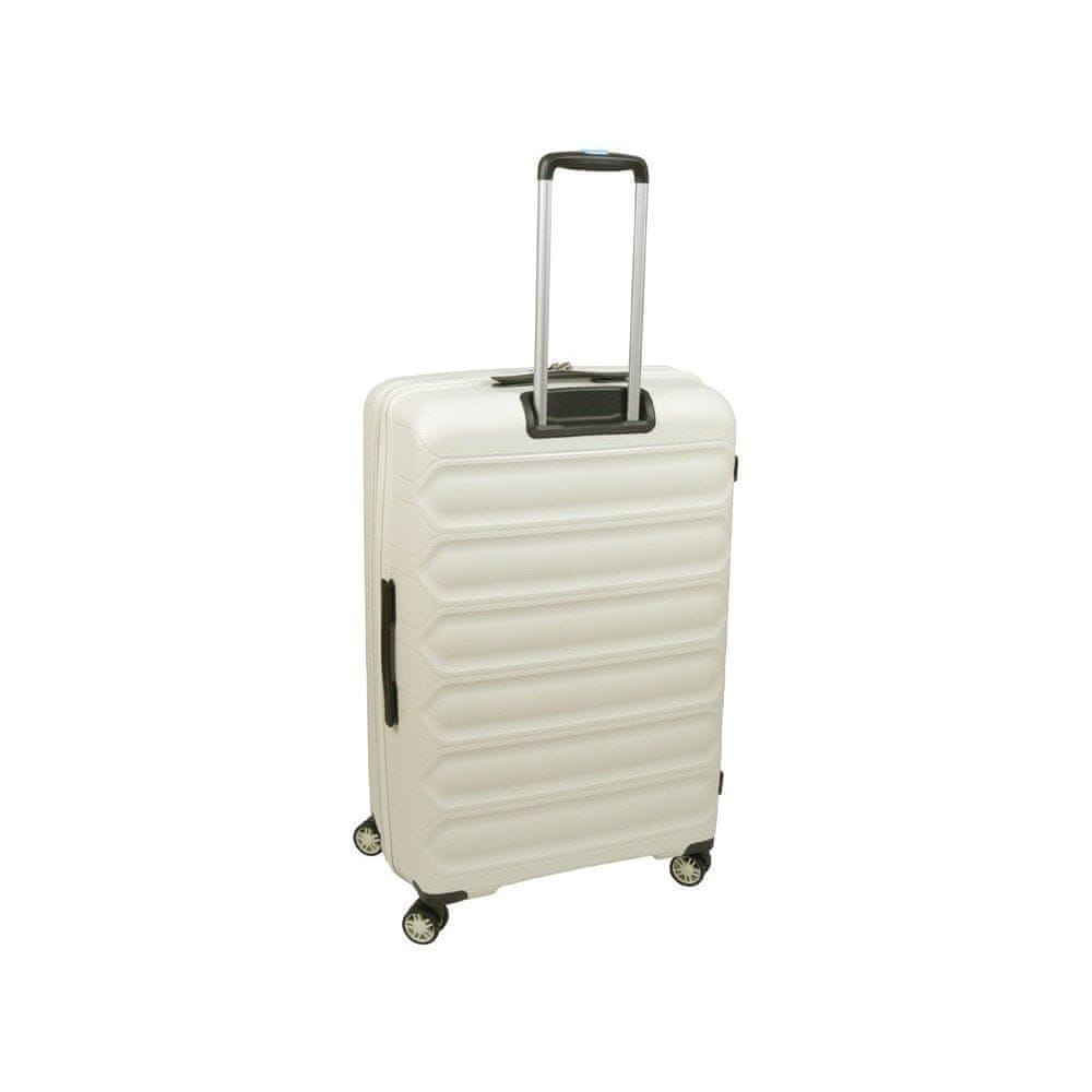 Velik kovček italijanske znamke Dielle iz kolekcije 100. Ohišje je izdelano iz trpežnega in dolgotrajnega polipropilena. Priročni ročaji na strani in na vrhu omogočajo enostavno namestitev v prtljažnik avtomobila ali odstranitev iz letališkega transporterja. Štiri dvojna, aksialno vrtljiva kolesa zagotavljajo udobno gibanje. Teleskopski, lahek in nastavljiv okvir olajša manevriranje. Kombinacijska ključavnica, ki je skladna s TSA, ščiti vsebino. Dodatna prednost je možnost razširitve kovčka za približno 5 centimetrov s posebno zadrgo. Notranjost je elegantno podložena, en del je opremljen s trakovi za pritrditev prtljage, drugi del pa je razdeljen s tkaninsko pregrado z dodatnimi žepi, ki pomagajo ohranjati red in organizacijo v kovčku. Kovček odlikujeta edinstven videz in kakovost izdelave.
