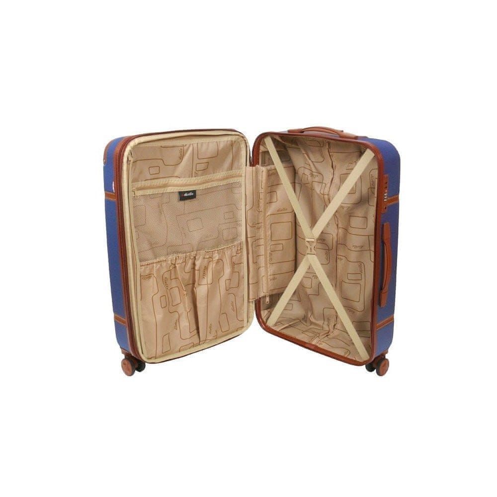 Srednje velik kovček italijanske znamke Dielle iz kolekcije 160. Ohišje je izdelano iz trpežnega in dolgo obstojnega ABS-a. Priročni ročaji na strani in na vrhu omogočajo enostavno namestitev v prtljažnik avtomobila ali odstranitev iz letališkega transporterja. Štiri dvojna, aksialno vrtljiva kolesa zagotavljajo udobno gibanje. Teleskopsko, nastavljivo ogrodje. Elegantni vložki iz eko usnja poudarjajo edinstven videz te kolekcije. Kombinacijska ključavnica po standardu TSA ščiti vsebino. Dodatna prednost je možnost razširitve kovčka za približno 4 centimetre s posebno zadrgo. Notranjost je elegantno podložena, en del je opremljen s trakovi za pritrditev prtljage, drugi del pa je ločen s tkaninsko pregrado z dodatnimi žepi. Ta kovček odlikujeta edinstven videz in kakovost izdelave.
