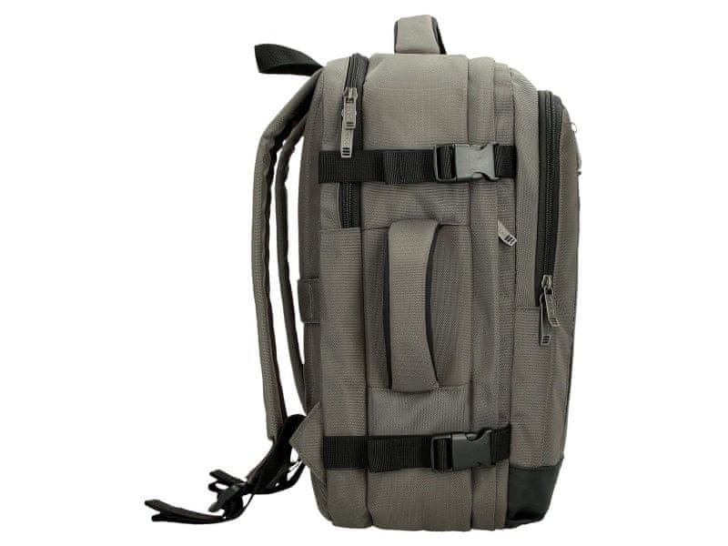 Batoh je vybavený zadným pásom na uchytenie na teleskopickú rukoväť kufra, čo uľahčuje presun počas cestovania.