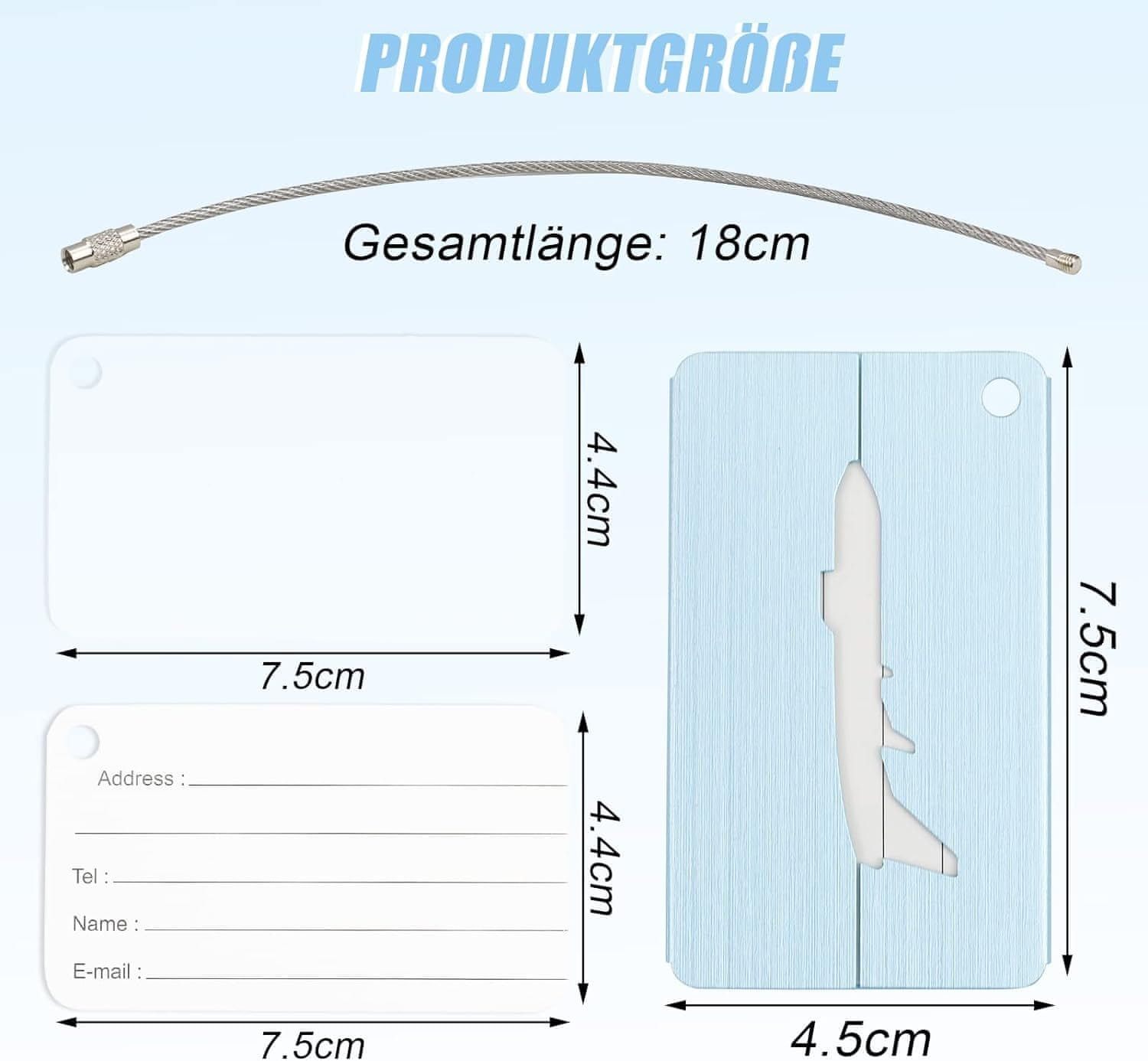 • Še posebej lahek:S težo le 13 gramov in notranjimi merami 7,5 cm x 4,5 cm so te oznake za prtljago izdelane iz vzdržljivega in lahkega aluminija.