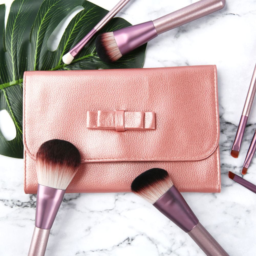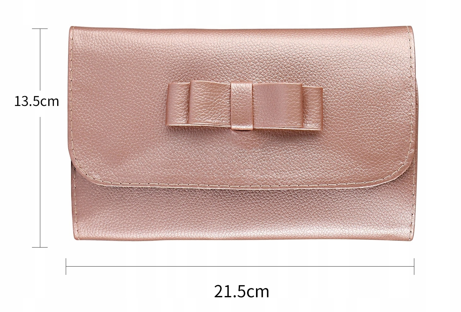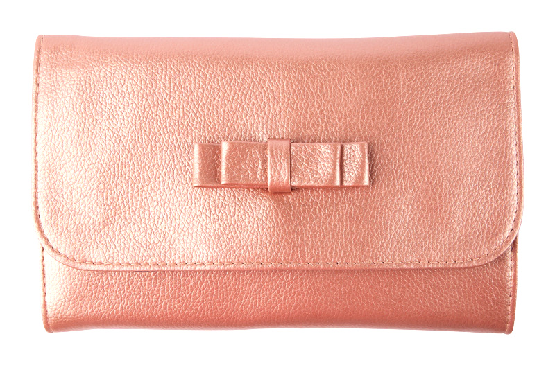 Elegantna torbica za čopiče in pripomočke za ličenje, v kovinsko lososovi barvi, okrašena z očarljivo pentljo.