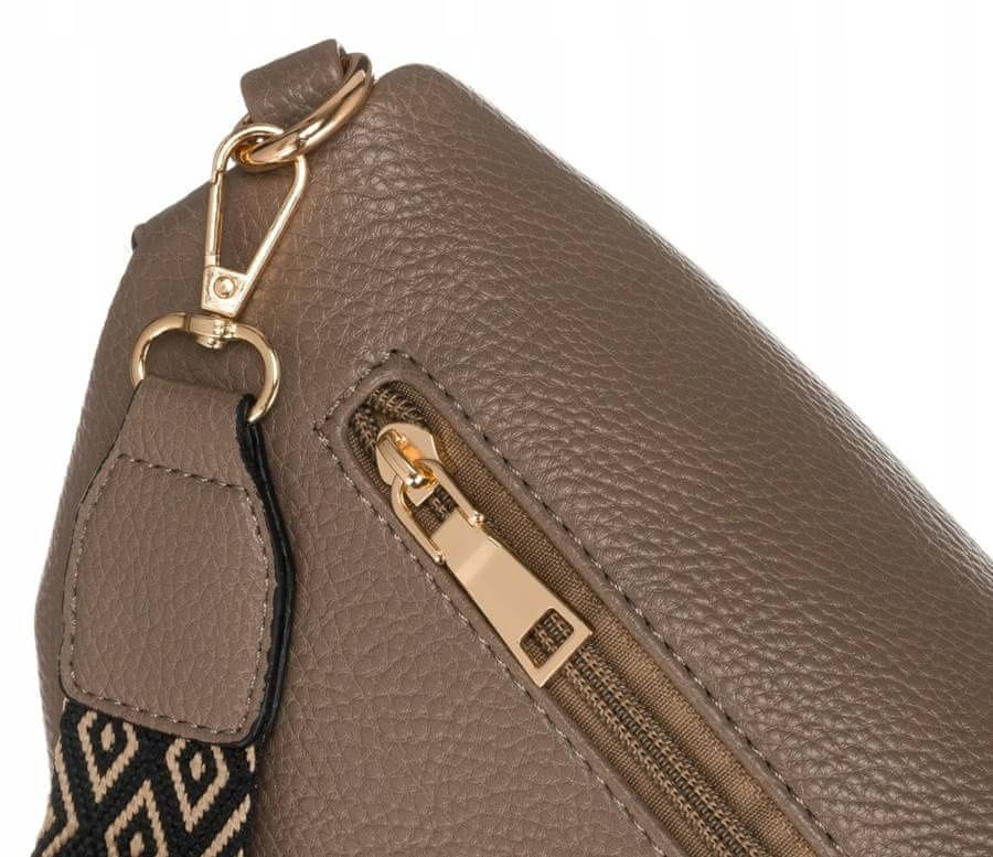 Modna torba z enim predelkom.Ima 2 dodatna žepa. Enega v notranjosti, drugega na zunanji strani. Obe se zapirata z zadrgo.Notranjost je podložena s poliestrom.