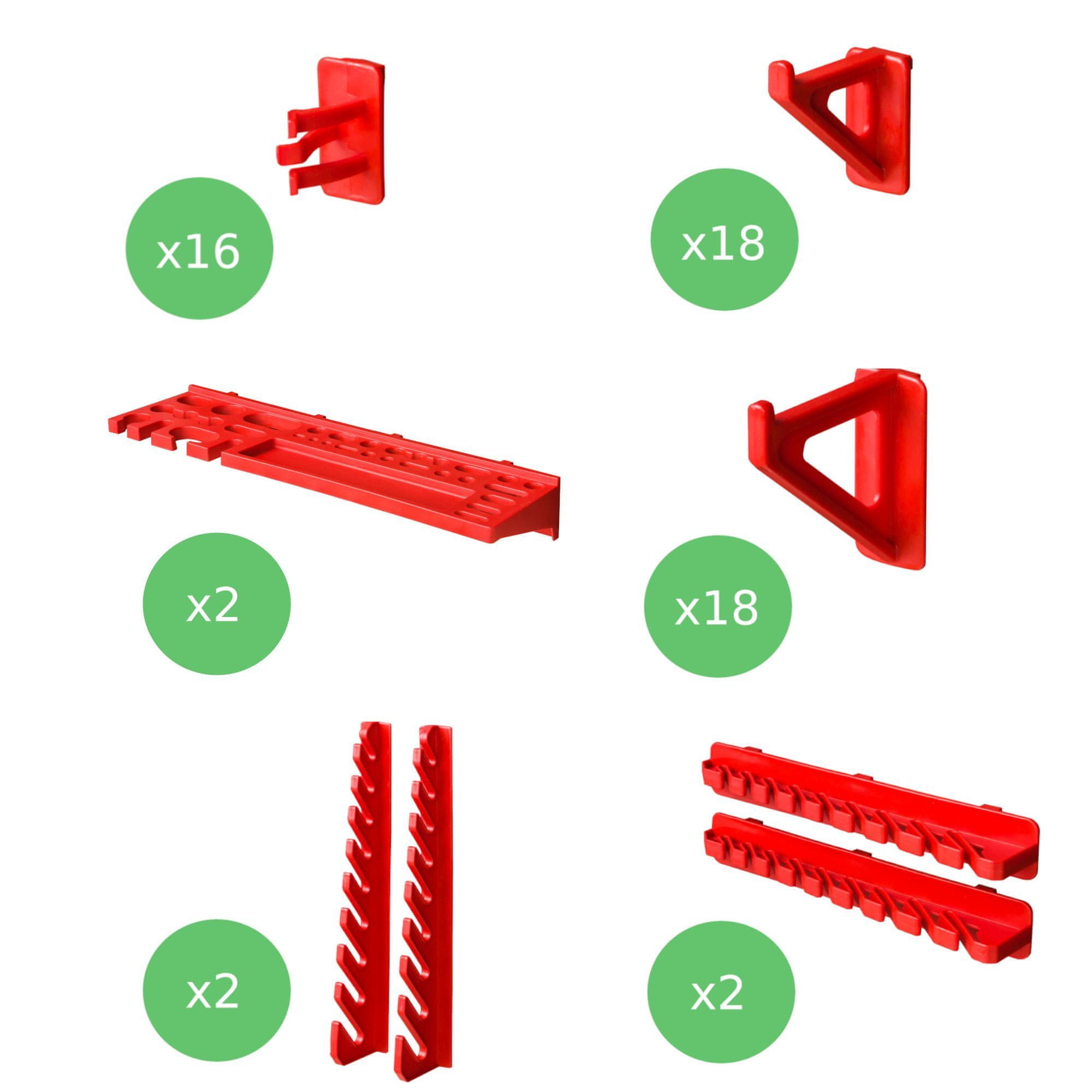 - Ročaj 1: 8 nosilcev za ključe (4 navpični in 4 vodoravni), 16 nosilcev za izvijače in drobno orodje, 18 obešalnikov 5,5 cm, 18 obešalnikov 3,5 cm.