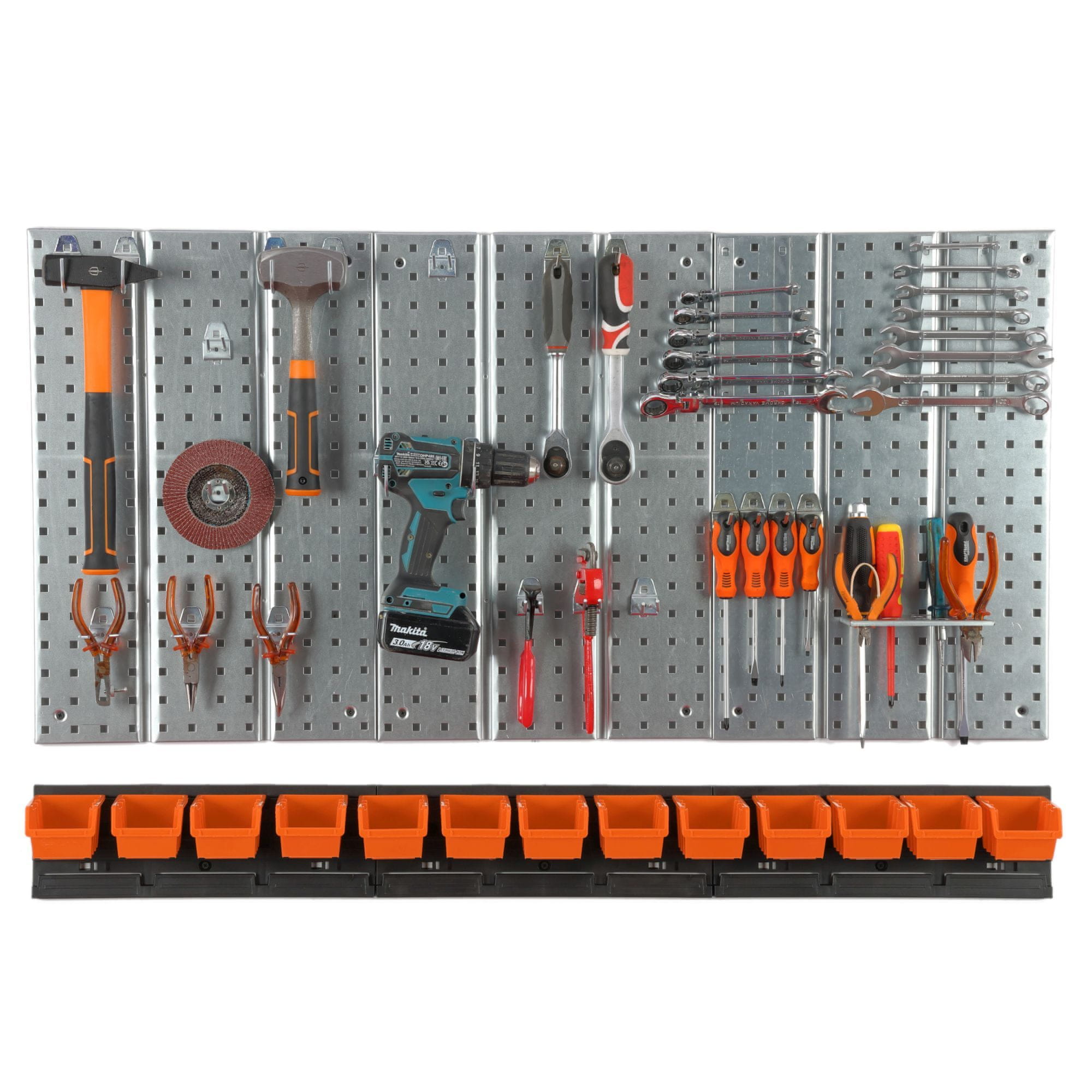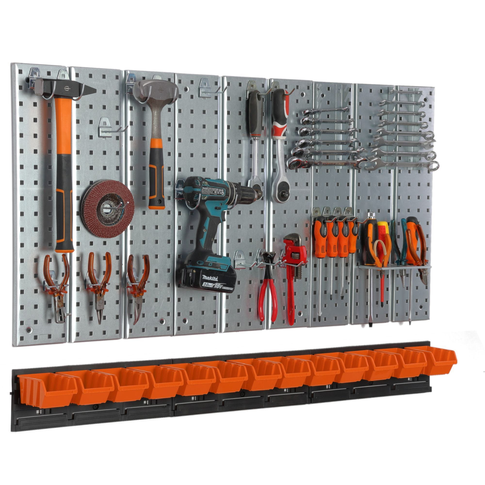 Kovinska stena za orodje 117×72 cm Sistem za shranjevanje z držali za orodje Kljuke za orodje in 13 odlagalnih škatel 80 × 115 × 60 mm Barva: oranžna Perforirana plošča Delavnica Garaža Pegboard Elekt