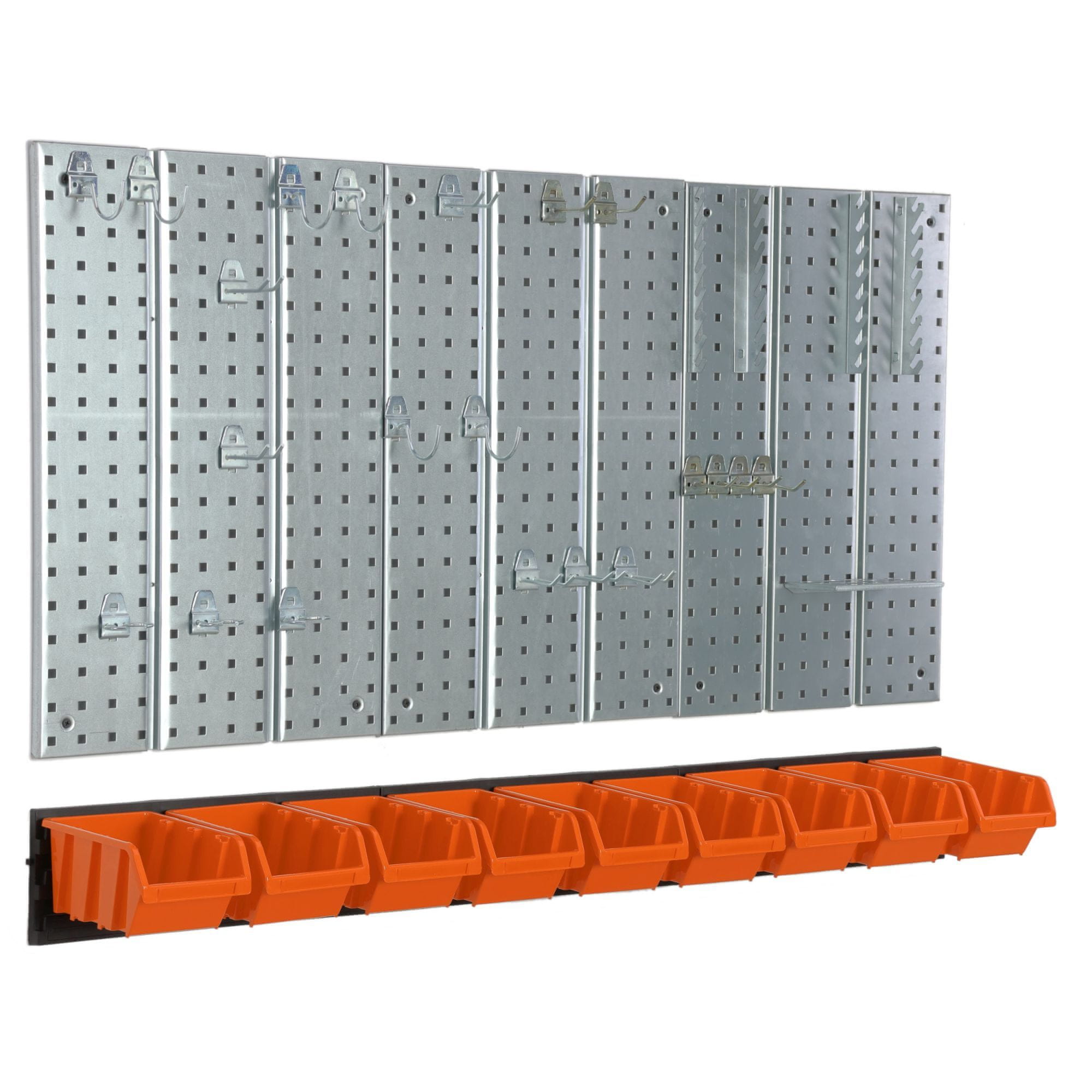 Kovinska stena za orodje 117×72 cm Sistem za shranjevanje z držali za orodje Kljuke za orodje in 9 odlagalnih škatel 120 × 195 × 90 mm Barva: oranžna Perforirana plošča Delavnica Garaža Pegboard Elekt