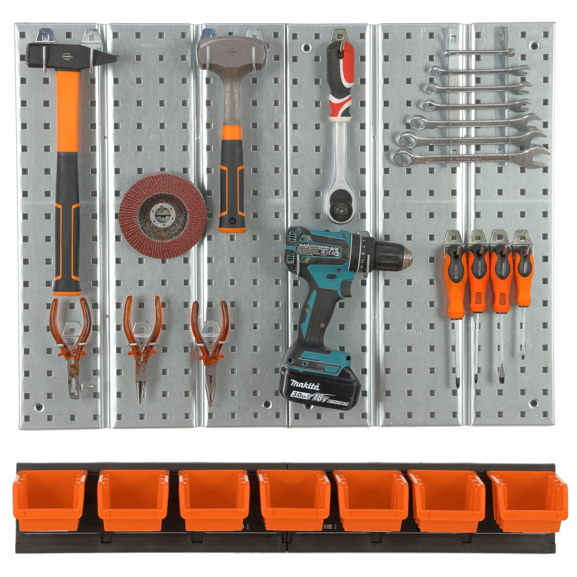 Komplet vključuje držala za električno orodje, univerzalne kavlje, držala za ključe in držala za ročno orodje.