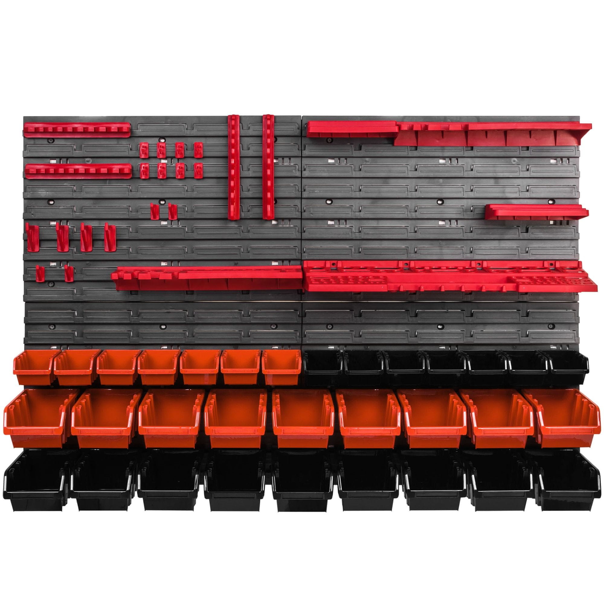 Naša vsestranska stenska polica z različnimi škatlami za zlaganje in držali za orodje zagotavlja red in preglednost na številnih področjih.