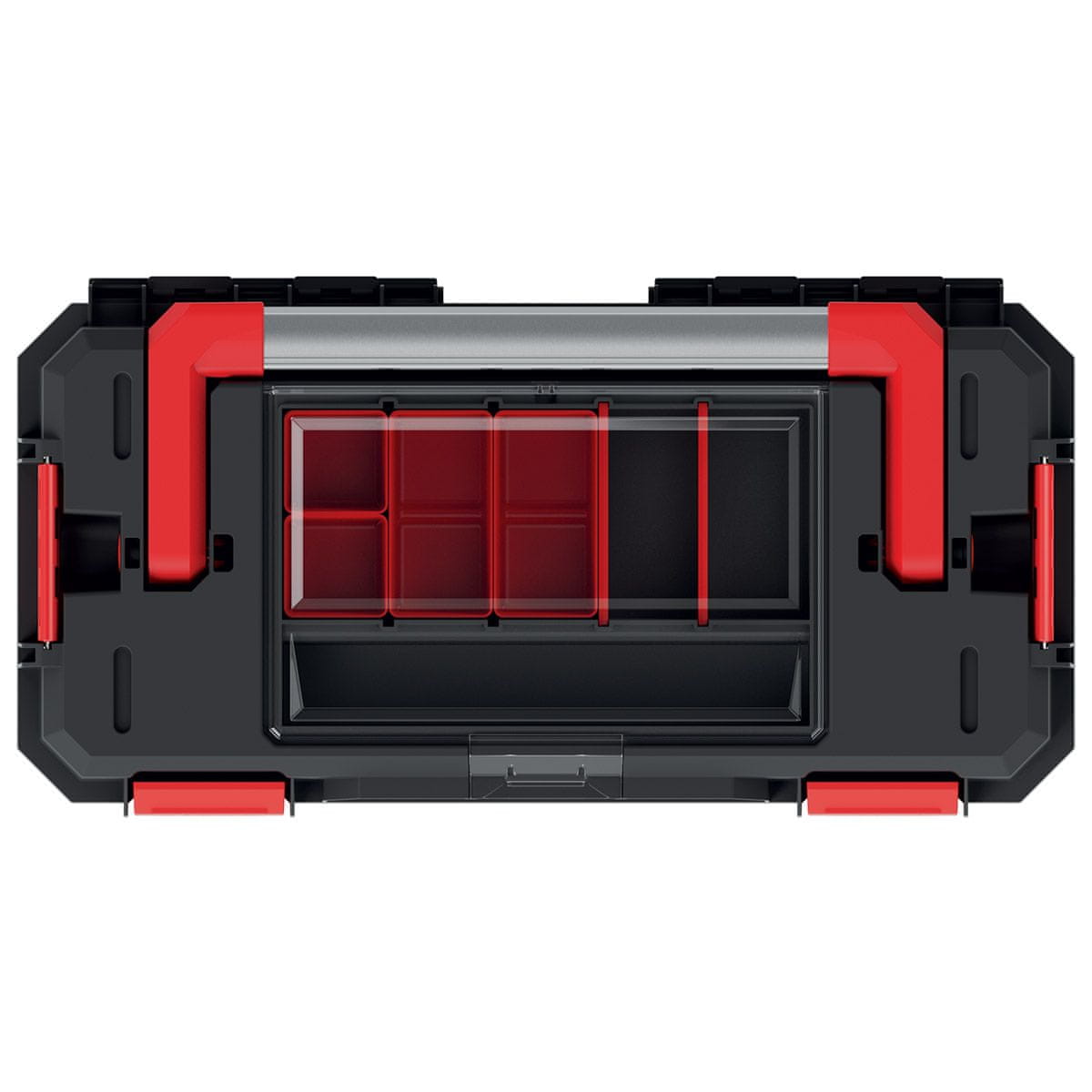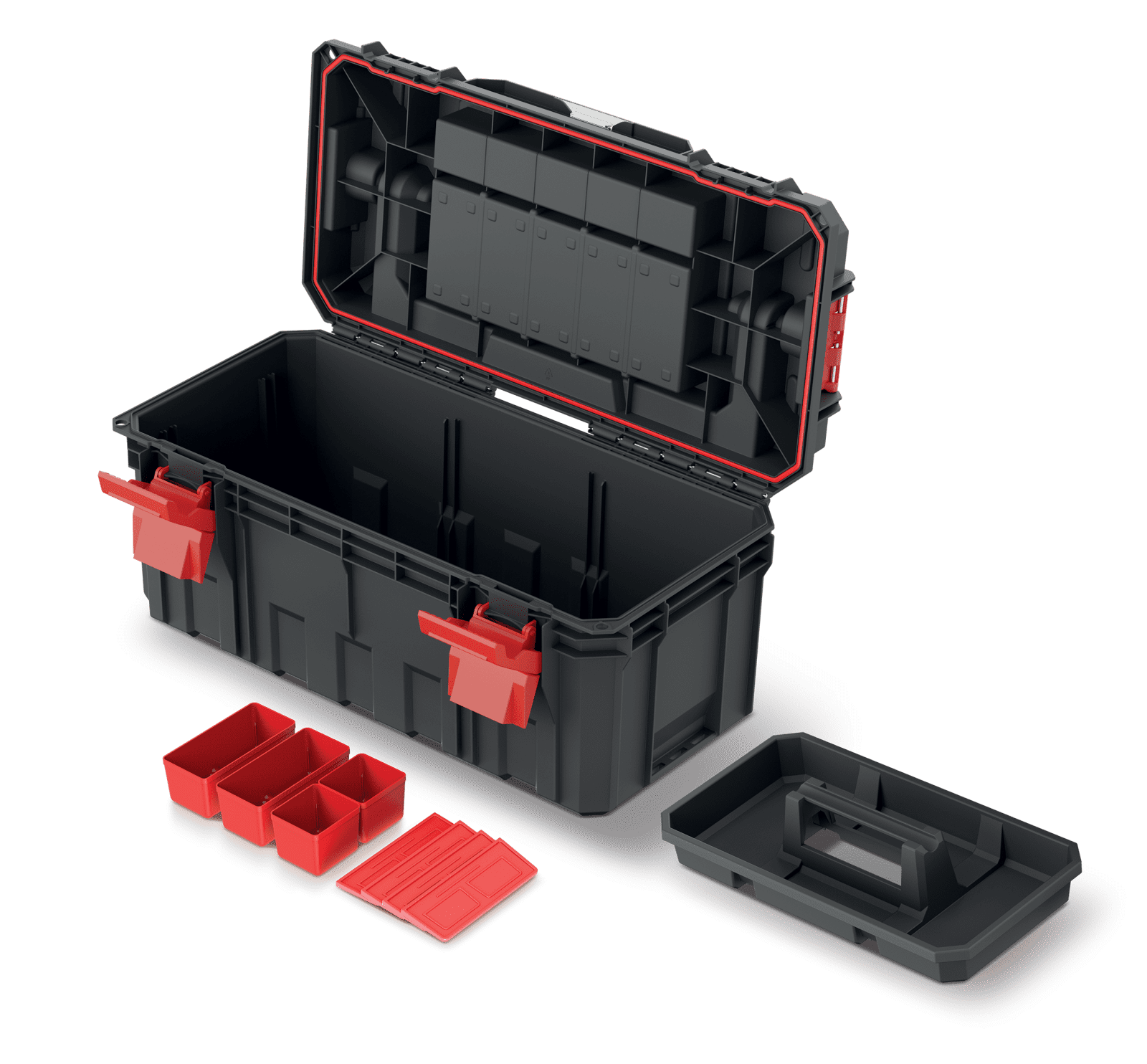 Ohišje kovčka je popolnoma odporno na prah in vodo (IP55). Za trdno zaprt kovček poskrbijo X-block zatiči, ki ne bodo popustili niti pri večji obremenitvi. Kovček ima na vrhu pokrova prostore za shranjevanje s posodicami in ločniki, kar vam bo omogočilo hiter dostop do drobnega materiala. Zgornji del kovčka pokriva prozoren polikarbonat.