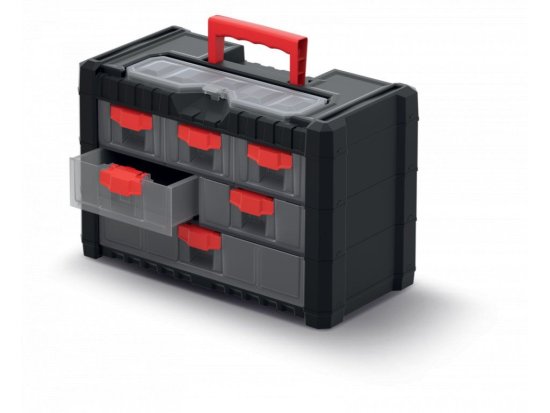 Prenosni organizator s 6 izvlečnimi predali in enim prostorom za shranjevanje na pokrovu. Organizator lahko obesite na steno ali ga shranite na polico na mizi. Ta organizator je primeren za shranjevanje majhnih ali večjih predmetov (vijaki, matice, podložke, tesnila, rezervni deli itd.). Sistem za shranjevanje MULTICASE CARGO uporabljajo gospodinjstva, podjetja, delavnice itd. S tem organizatorjem boste imeli vse na enem mestu. Predali so zavarovani pred nenamernim izmetom.