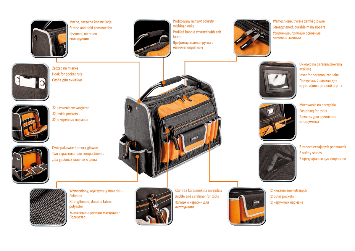 NEO torba za montažo, izdelana iz 600 D poliestra, ki zagotavlja dolgotrajno obstojnost torbe. Ima ojačano dno s stojali, ki ščitijo vsebino pri delu v težkih razmerah. Torba je opremljena z močnim ročajem in trakom za prenašanje. Njena velika prednost je množica 12 zunanjih in 32 notranjih žepov.