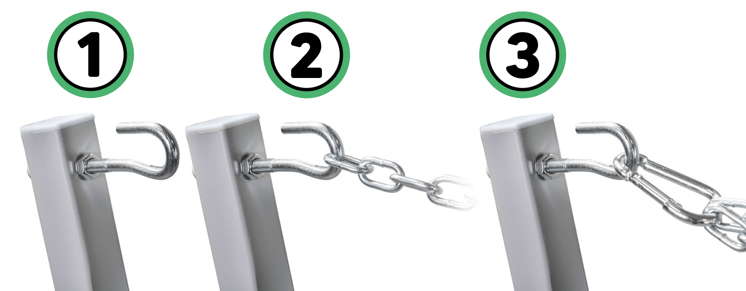 preprečujejo praskanje površine in pogrezanje v mehka tla. Lahko jih pritrdite ali odstranite in prilagodite okvir svojim potrebam! ⭐️ Izberite premišljeno zasnovo! Zaradi teh lastnosti je naš okvir najvarnejša rešitev, ki vam bo služila dolga, dolga leta! ☘️ 3 NAČINI ZA MONTAŽO VISEČE MREŽE ☑️ Vaša viseča mreža, vaša pravila! Namestite jo lahko na tri različne načine, odvisno od vaših potreb in dolžine viseče mreže: ➡️ Neposredno na kavelj