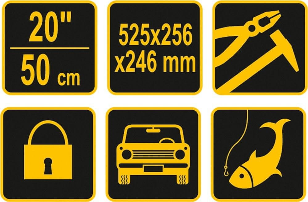 20-palčna škatla za orodje z izvlečnim pladnjem in držalom za nastavke. Izdelana iz plastike. Trdna zaponka preprečuje nenamerno odpiranje med transportom. Škatla ima posebej oblikovane stranske ročaje za enostavno prenašanje. Zaklenete jo lahko s ključavnico. Uporablja se za priročno prenašanje različnih predmetov, kot so orodje, ribiški pripomočki itd.