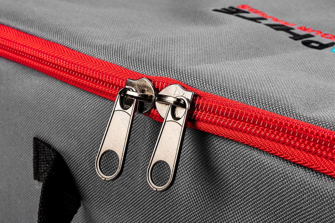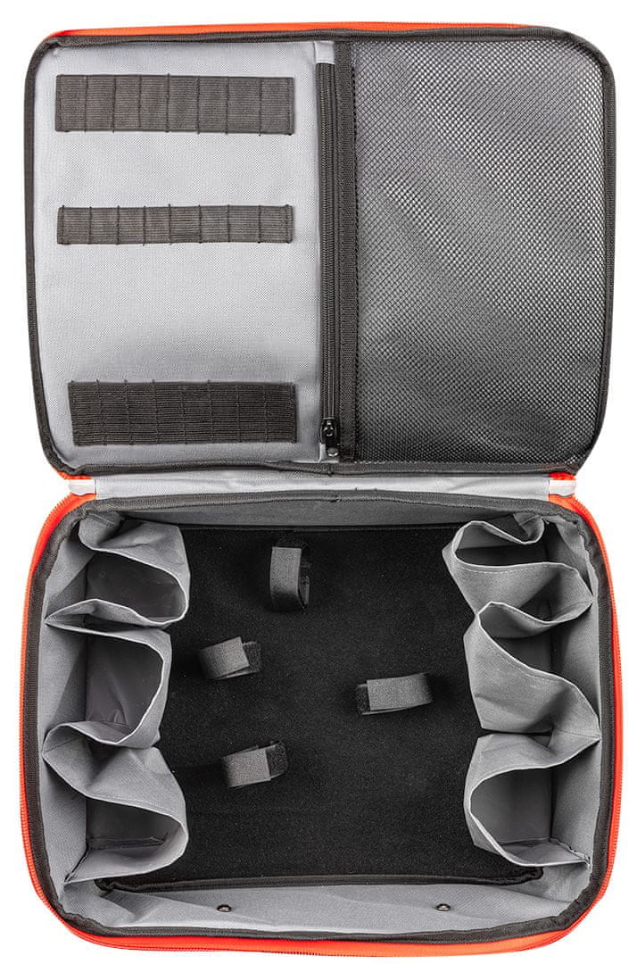 Kovček za električno orodje iz blaga GRAPHITE (ref. 58G094) ima prostornino 25 litrov in dimenzije 46 × 36 × 15,5 cm. Ima šest notranjih žepov, štiri notranje trakove za orodje za pritrditev vrtalnika/vijačnika, baterij ali polnilnika, dodatne pritrdilne točke in žep z zadrgo za pribor. Torba ima ročaj za nošenje in nastavljiv naramni trak. Trpežna poliestrska konstrukcija.