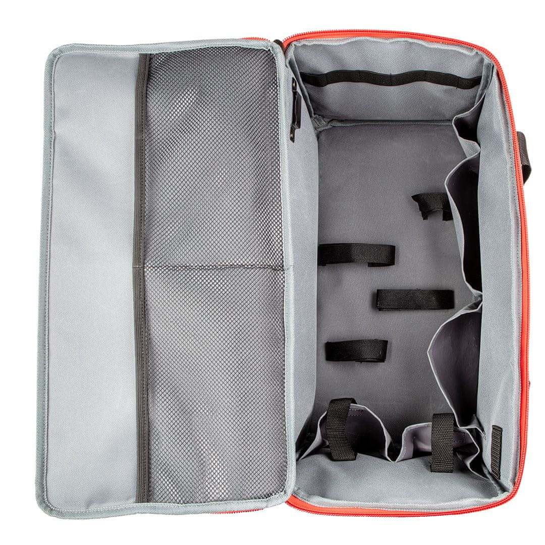 Trpežna torba za električno orodje GRAPHITE Energy+ s prostornino 24 litrov je izdelana iz gosto tkanega materiala, ki zagotavlja visoko odpornost proti obrabi. Notranjost iz laminiranega poliestra ščiti vsebino torbe pred vlago in neugodnimi vremenskimi razmerami. Torba ima 14 zunanjih žepov, 7 prostornih notranjih žepov in 14 kavljev za orodje. Ti kavlji omogočajo pritrditev orodja, kot so vrtalniki/vijačniki (kovinski kavelj) ali merilni trak (tkaninski kavelj). Dimenzije torbe omogočajo udobno nošenje do štirih električnih orodij skupaj z njihovo opremo (baterije, polnilnik in dodatna oprema). Baterije in druge predmete je mogoče pred premikanjem pritrditi z dodatnimi ježki. Torba ima udoben in trden ročaj za nošenje ter nastavljiv naramni trak s kovinskimi karabinkami. Ojačano, vodoodporno dno z nogami ščiti vsebino med delom v težkih pogojih. Zadnja plošča ima okno za personalizirano nalepko ali vizitko.