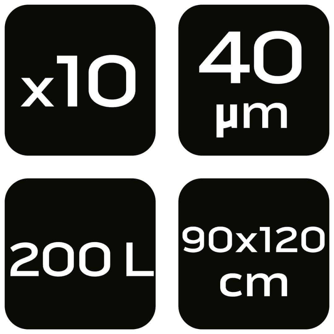 Vrečke za odpadke NEO TOOLS 200 L, rjave, 40 mikronov, paket 10 kosov (15–995) so 200-litrske vreče, na voljo v kompletu 10 kosov na roli z dvojno zatesnjenim dnom. So rjave barve in debele 40 mikronov. Izdelane so iz trpežnega LDPE materiala, merijo v širino 90 cm in v višino 120 cm. Idealne so za travo, listje in vrtne odpadke, pa tudi za uporabo pri cvetju in rastlinah doma ali v cvetličarnah. Vrečke za odpadke NEO TOOLS so zagotovljeno dolgotrajen izdelek.