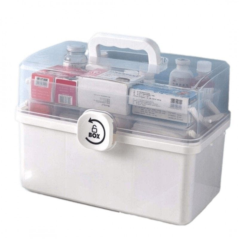 Praktična medicinska omarica Nič več nereda! Z našim zabojnikom boste uredili domačo omarico za zdravila. Končno bodo vsa vaša zdravila in medicinski izdelki urejeni in shranjeni na enem mestu. Škatla je velika in prostorna. Vanj lahko poleg embalaže z zdravili spravite tudi druge medicinske pripomočke, kot so povoji, obloge, termometri itd. Zahvaljujoč izvlečnim policam lahko hitro in priročno razvrstite zdravila. Za odpiranje škatle obrnite gumb v levo. To je zelo preprosto! Dimenzije: 34 × 21,5 × 19 cm Izdelek je predpakiran v škatli.