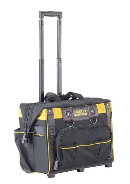 Stanley Fatmax kovček ima kolesa in močan teleskopski ročaj za transport težkih orodij. Številni zunanji in notranji razdelki omogočajo največjo možno organiziranost, široka zgornja odprtina pa lažji dostop. Širok sprednji žep z notranjimi razdelki ima funkcijo delovne postaje