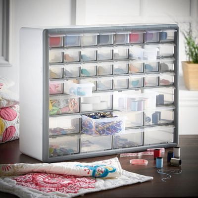 • Opremljen je s 44 prostornimi predali – 12 predalov dimenzij 53 × 134 × 38 mm in 32 predalov dimenzij 113 × 133 × 53 mm. Predali so prozorni, tako da lahko vidite, kaj je v notranjosti.