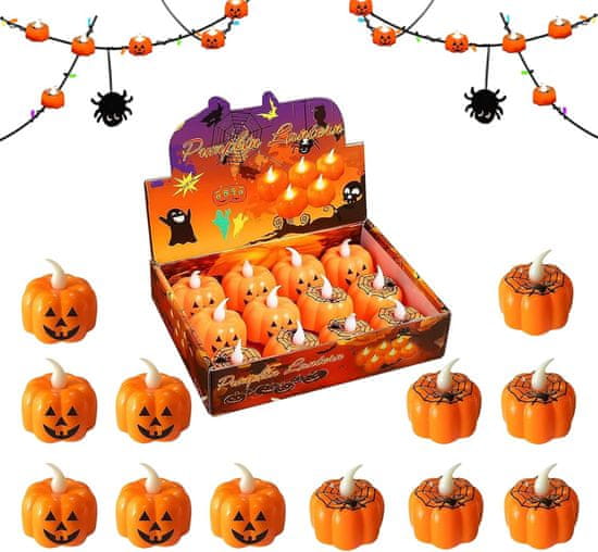 Komplet 12 LED sveč za noč čarovnic v obliki buče 45 × 45 mm, oranžne