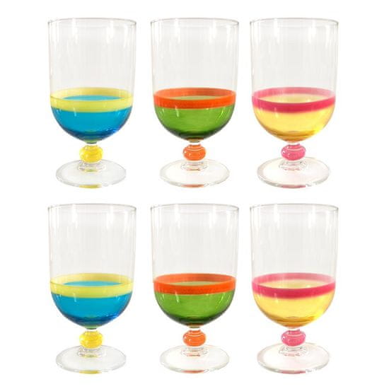 Set kelihov Nuance Basic je izdelan iz prozornega stekla, ki ga krasi spiralni vzorec in obarvan spodnji del, ki mu daje živahen in unikaten videz. V setu je 6 kozarcev na peclju v različnih barvah, ki so primerni za serviranje vode, soka, vina, alkoholnih in osvežilnih pijač ter kremnih sladic. Primerni so za pomivanje v pomivalnem stroju.