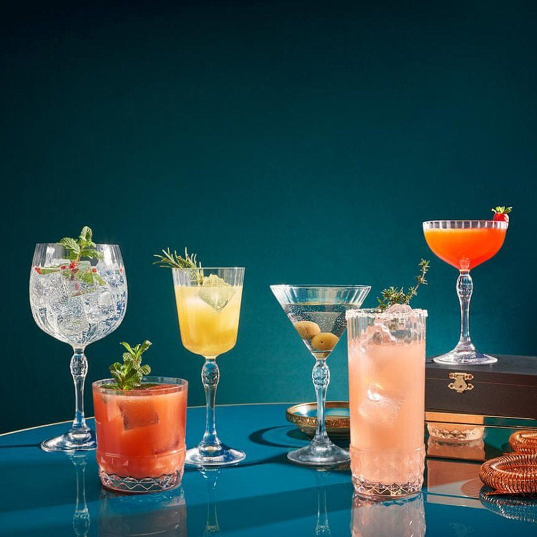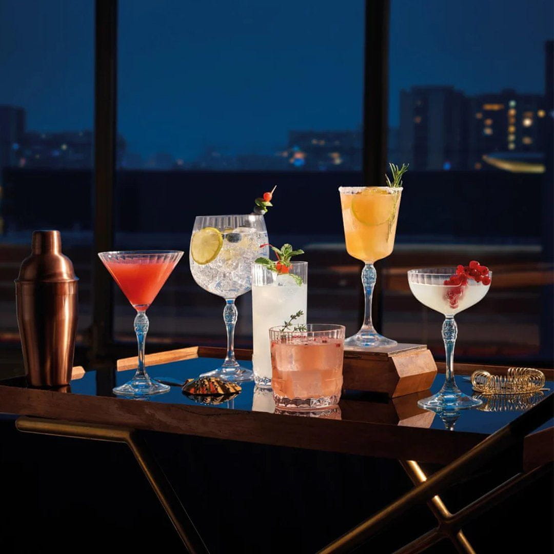 Kelihi za martini America 20's so del elegantne linije, navdihnjene z glamurjem trendovskih ameriških klubov iz dvajsetih let 20. stoletja, kjer se je poslušal jazz, se pogovarjalo o umetnosti in slavilo življenje. Kelih s prostornino 155 ml je izdelan iz elegantnega kaljenega stekla (brez svinca) z gostimi fasetami (kvadratno brušeno steklo), ki ustvarja zanimive svetlobne učinke. Držalo krasi motiv okrašene kapljice. Premer keliha je 9,4 cm, višina pa 15,4 cm. V setu je 6 kelihov, ki jih lahko pomijete v pomivalnem stroju.