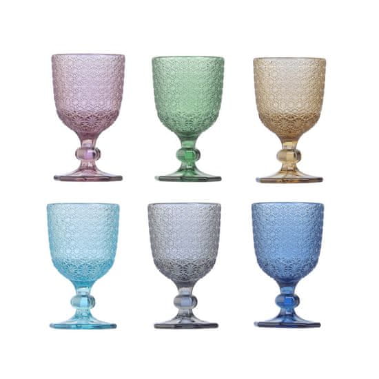 Set kelihov Mozart s prostornino 80 ml, je idealen za postrežbo likerjev in ostalih žganih pijač. Izdelan je iz kakovostnega barvnega stekla z zanimivim reliefnim vzorcem, ki setu daje eleganco in unikatnost. V setu je 6 kozarcev različnih barv, ki so primerni tudi za pomivanje v pomivalnem stroju.