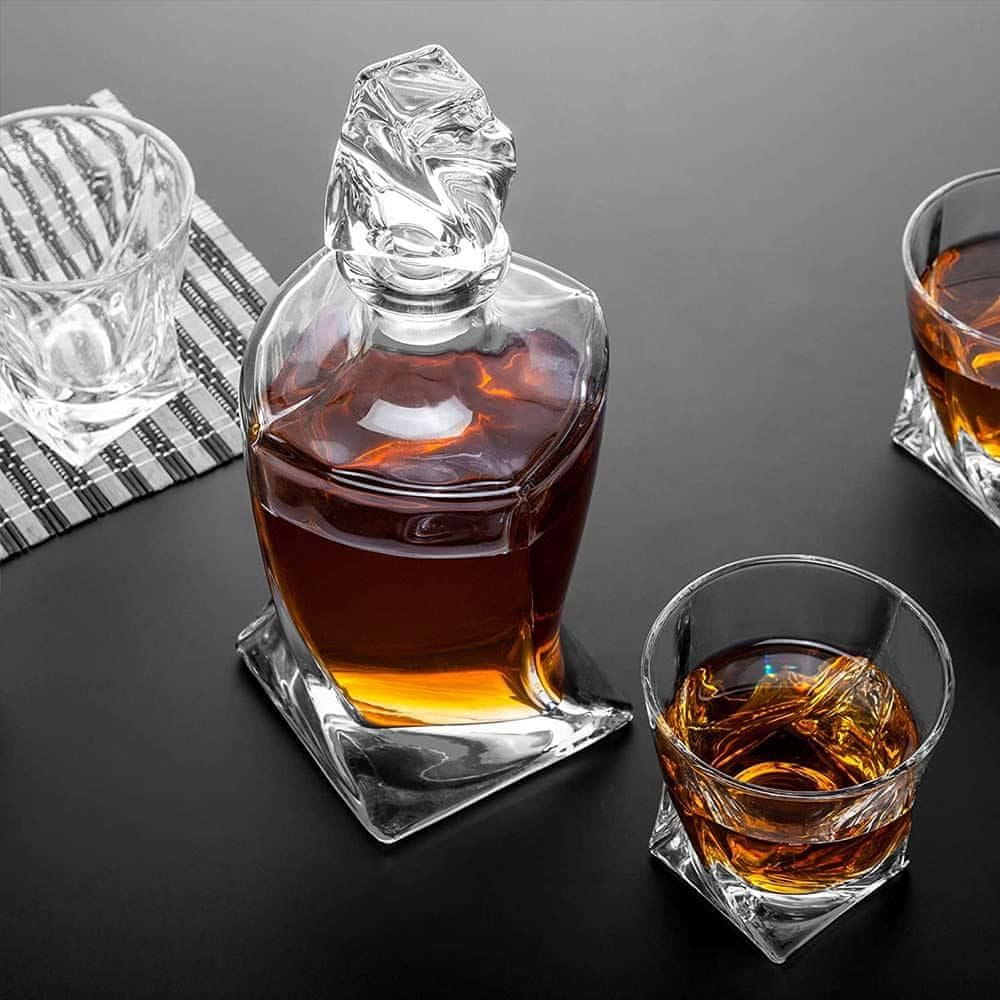 Ta edinstveno oblikovana karafa je prava paša za oči doma. Vrč ima prostornino 85 cl in konstrukcijo iz kristalno čistega stekla, ki si zasluži vaš najboljši viski. Priložena sta dva kozarca, klešča za led, lijak, kot tudi devet kamnov za viski in žametna vrečka za shranjevanje. Priložena je tudi lepa škatla za shranjevanje iz temnega lesa.