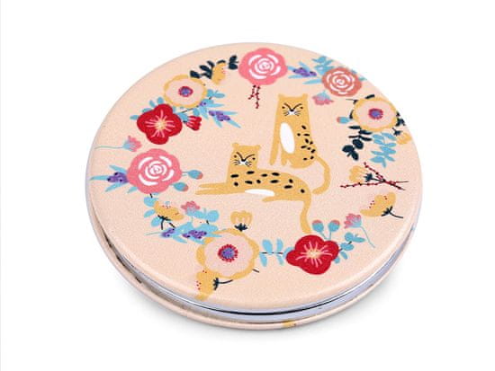 Okroglo odpirajoče se ogledalo je odličen pripomoček za popravljanje ličil čez dan. Je ravno, zato se odlično prilega vsaki ženski torbici. Izdelano je iz visokokakovostnega eko usnja z živalskim okrasjem. Potisk je na zgornji in spodnji strani. V notranjosti sta 2 ogledali, eno od njiju je povečevalno. Naš nasvet: ogledalo bo lepo majhno darilo za valentinovo ali druge priložnosti. Ogledala v mešanem paketu 12 kosov so pakirana v kartonski škatli. V notranjosti ima stojalo, primerno za razstavljanje v trgovini, glejte fotografijo. Velikost škatle je 13 × 24 × 8 cm.