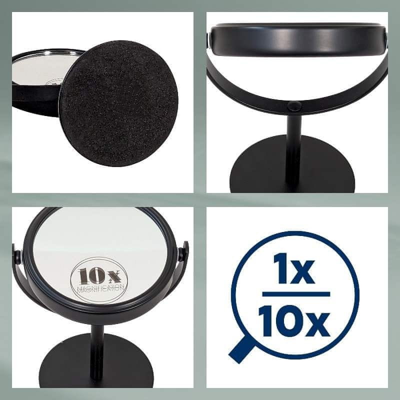 Privlačno in praktično: majhno talno ogledalo Selena z 1× in 10× povečavo je idealno za podrobnosti. Črno ogledalo je izdelano iz kovine in ima premer 8 cm (zrcalna površina 7 cm) ter je visoko 15 cm. Zrcalna površina je vrtljiva! Mat kovina Vrtljivo, enojna/10-kratna povečava, 15 cm v, 8 cm 7 cm zrcalna površina